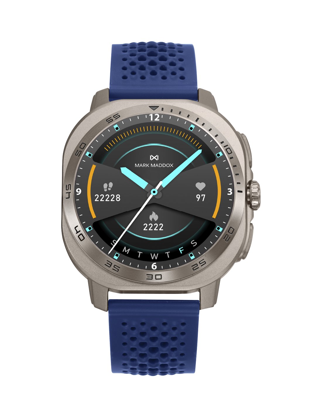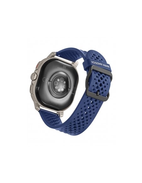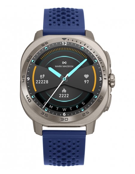 Reloj smart con caja metálica plateada y correa de silicona azul que combina tecnología, confort y estilo. Su pantalla táctil permite gestionar llamadas, mensajes y notificaciones, además de monitorizar sueño, oxígeno y actividad diaria. Un reloj moderno y funcional diseñado para quienes buscan rendimiento sin renunciar al diseño.