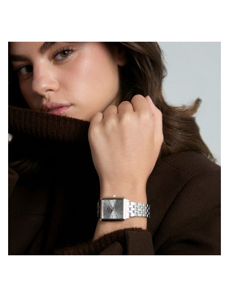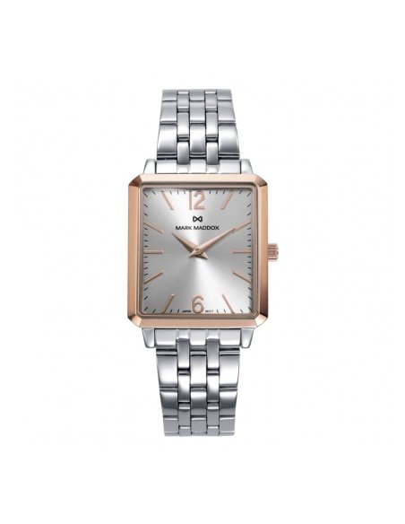 Sofisticación y delicadeza se reflejan en este reloj de mujer, con caja bitono de acero e Ip rosa y un brazalete de acero que combina resistencia y estilo. La esfera plata, con índices y números árabes, junto a las agujas horarias en color Ip rosa, asegura una lectura clara y elegante, mientras que el cristal mineral protege la pieza, convirtiéndola en un accesorio ideal para completar cualquier look con un toque femenino y distinguido.