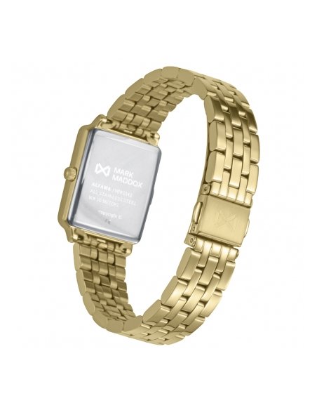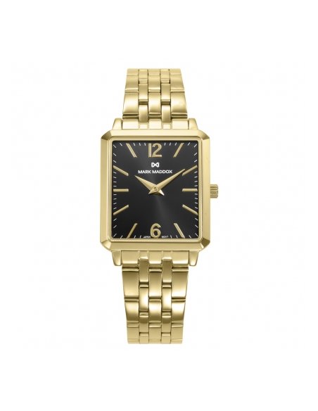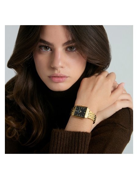 Diseño y elegancia se combinan en este reloj de mujer, con caja y brazalete de acero con baño Ip dorado que aportan un toque de lujo sutil. La esfera negra, con índices y números árabes, junto a las agujas horarias en color dorado, asegura legibilidad y estilo, mientras que el cristal mineral protege la pieza, convirtiéndola en un accesorio sofisticado para cualquier ocasión.