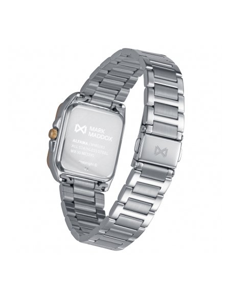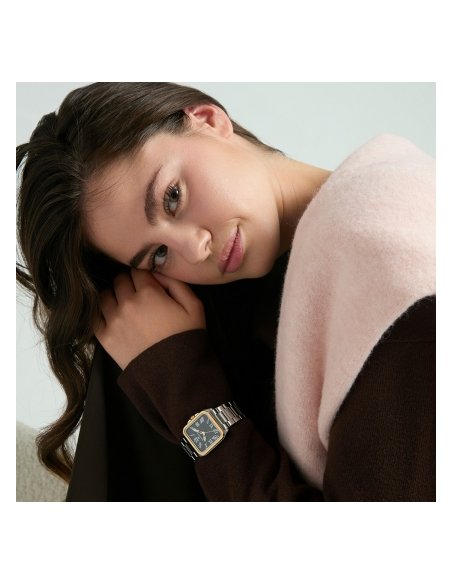 Elegancia contemporánea define este reloj de mujer, con caja bitono de acero e Ip dorado que combina sofisticación y estilo. La esfera negra con números romanos y las agujas horarias en dorado aportan claridad y distinción, mientras que el cristal mineral protege la pieza, convirtiéndola en un accesorio ideal para quienes buscan un toque de lujo discreto en su día a día.