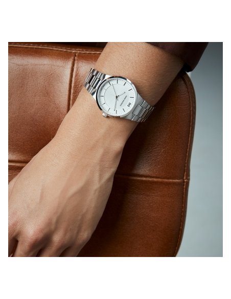 Un toque de sencillez y armonía define este reloj de mujer, con caja y brazalete de acero que aseguran durabilidad y estilo contemporáneo. La esfera blanca, acompañada de índices y agujas en color plata, aporta claridad y distinción, mientras el cristal mineral mantiene la pieza protegida.
