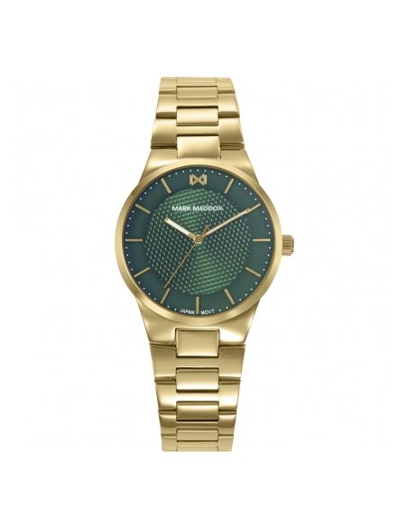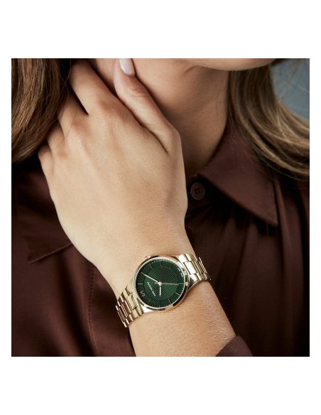 Este reloj de mujer combina diseño y funcionalidad, con caja y brazalete de acero IP dorado que destacan por su brillo sofisticado. La esfera verde, con índices y agujas en IP dorado, aporta claridad y estilo, protegida por un cristal mineral de alta calidad.