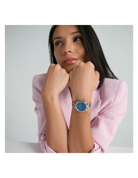 Elegancia atemporal para este reloj de mujer de dos agujas, con esfera azul que combina índices y números romanos. Caja y brazalete de acero que aportan resistencia, mientras que las agujas en color plata destacan con sutileza. Cristal mineral que protege y mantiene la precisión del reloj.