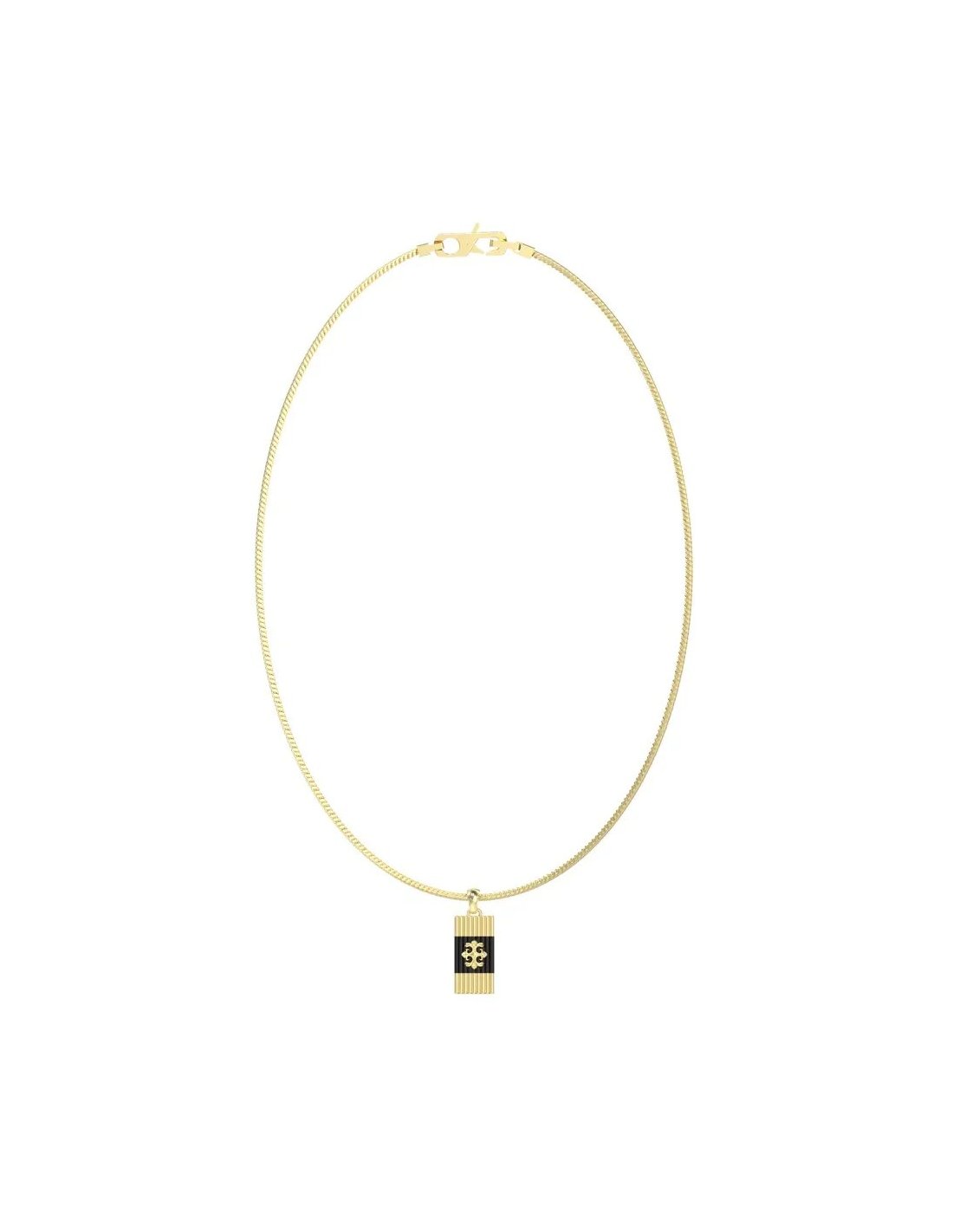 Collar Guess Hombre Rebel Moon JUMN05067JWYGBKT fabricado en acero bañado en oro amarillo compuesto por una atractiva cadena redonda de 60 cm de largo. Colgante rectangular de 23 x 11mm en negro y dorado con el logo de guess, y perfecto para grabar en la parte de atrás.