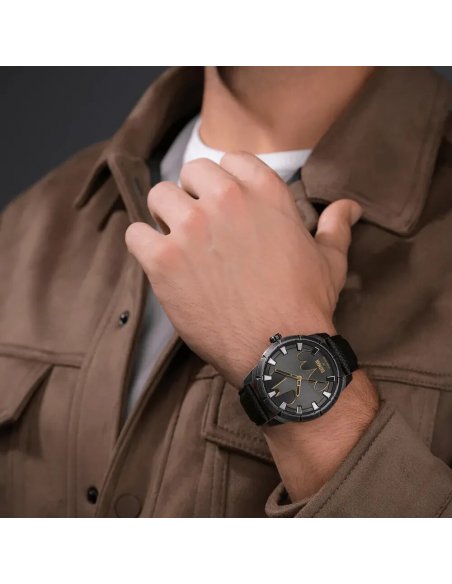 Este reloj marca Police tiene una caja de Inox con un diámetro de 45 mm y cuenta con una correa de piel. Dentro de la caja se encuentra un mecanismo de Miyota de alta calidad el cual esta protegido por un cristal Mineral.
