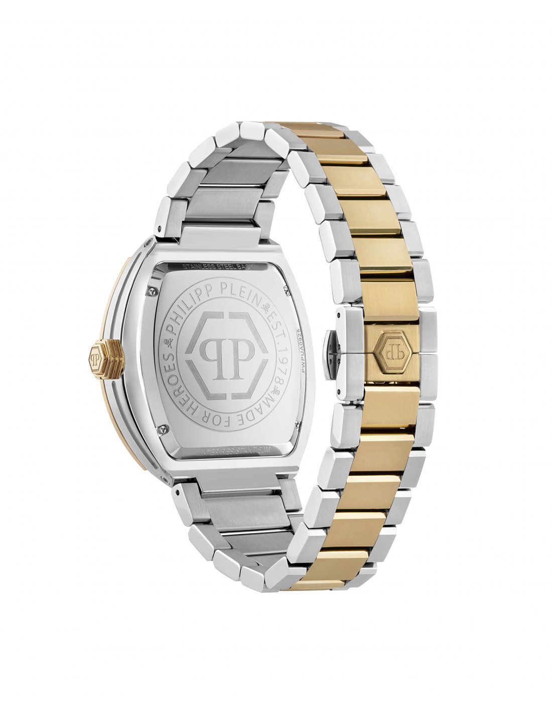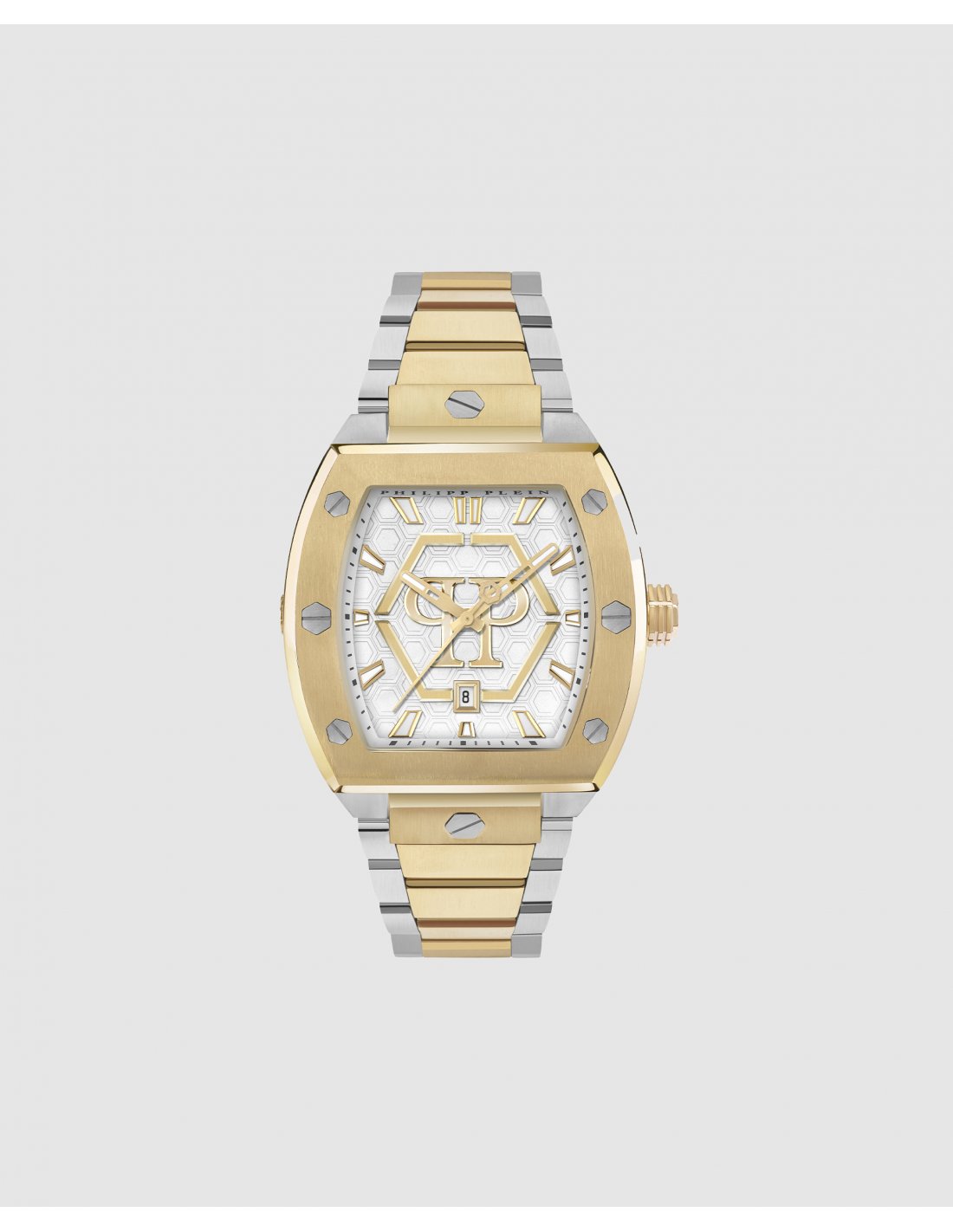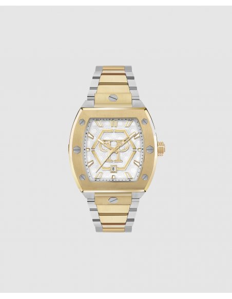 Reloj de hombre The hexagon phantom PWPUA0925 de acero y correa bicolor oro. Reloj de hombre Philipp Plein con caja de acero inoxidable IP oro amarillo de 44 mm, esfera de acero inoxidable IP oro amarillo y br azalete en IP oro amarillo y acero inoxidable y movimiento de cuarzo de 3 agujas (Myota 2115). El Hexagon Phantom redefine la elegancia contemporánea con su icónica forma tonel, detalles modernos y una estética audaz que eleva cualquier look.