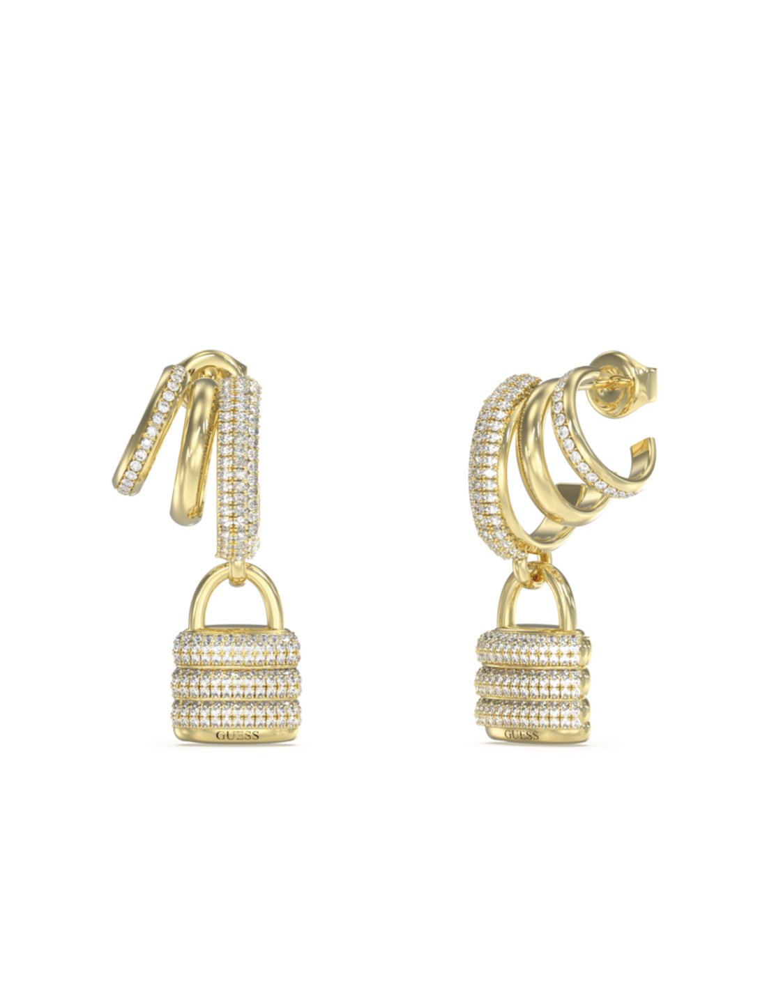 Pendientes de acero para mujer de la marca Guess. Pendientes dorados tipo huggie con candado colgando recubierto de pedrería. Símbolo del amor, el candado se rediseña para ser la pieza central de la elegante colección Guess My Secret de la marca amer …