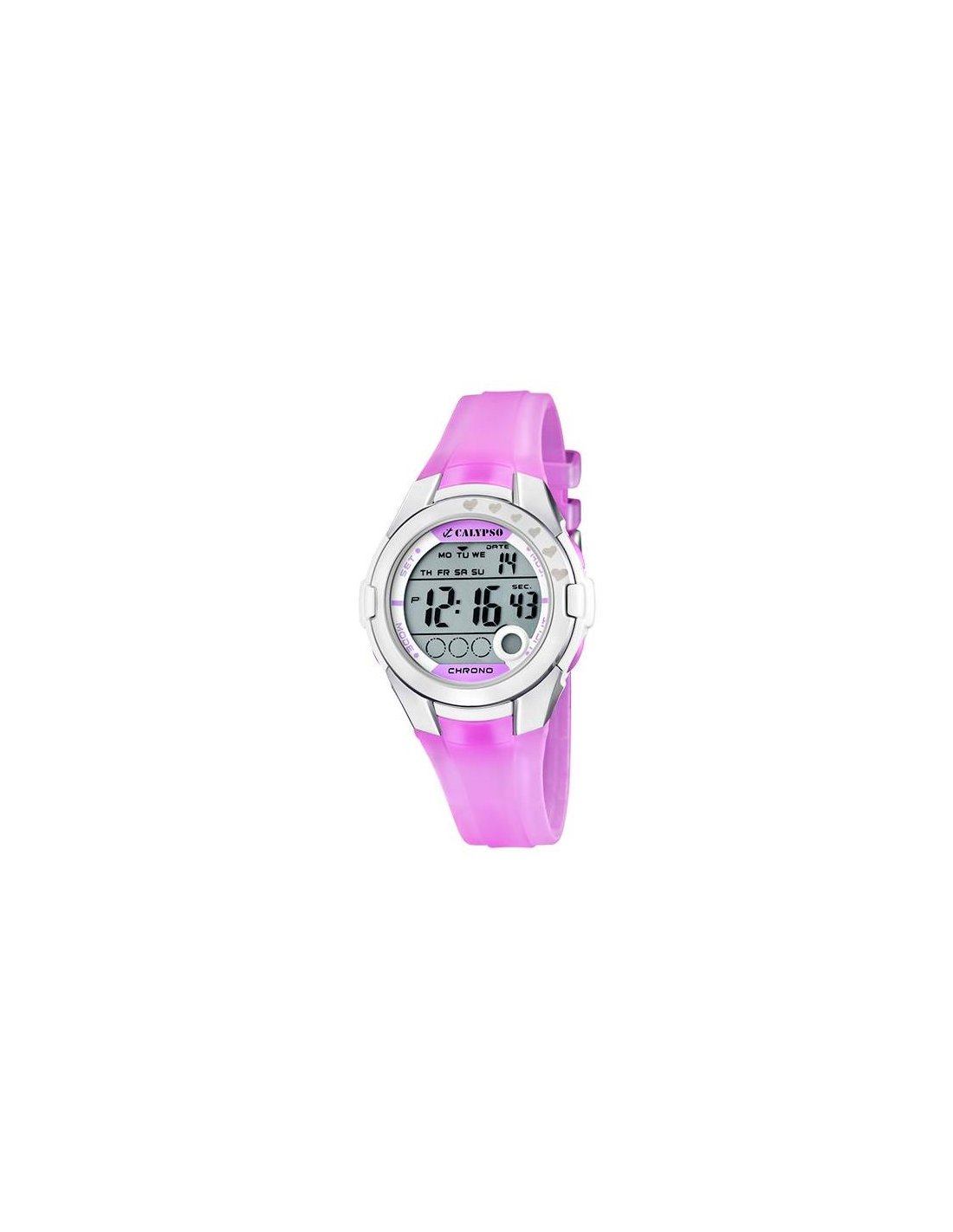 Reloj Calypso para niña fabricado en caucho plateado y morado. Se trata de un original reloj para niño con caja plateada de 37,85mm de diámetro con mecanismo digital protegido con cristal mineral con luz trasera. Su correa es de caucho en color morado con cierre de hebilla. Resistente al agua hasta 100 metros.