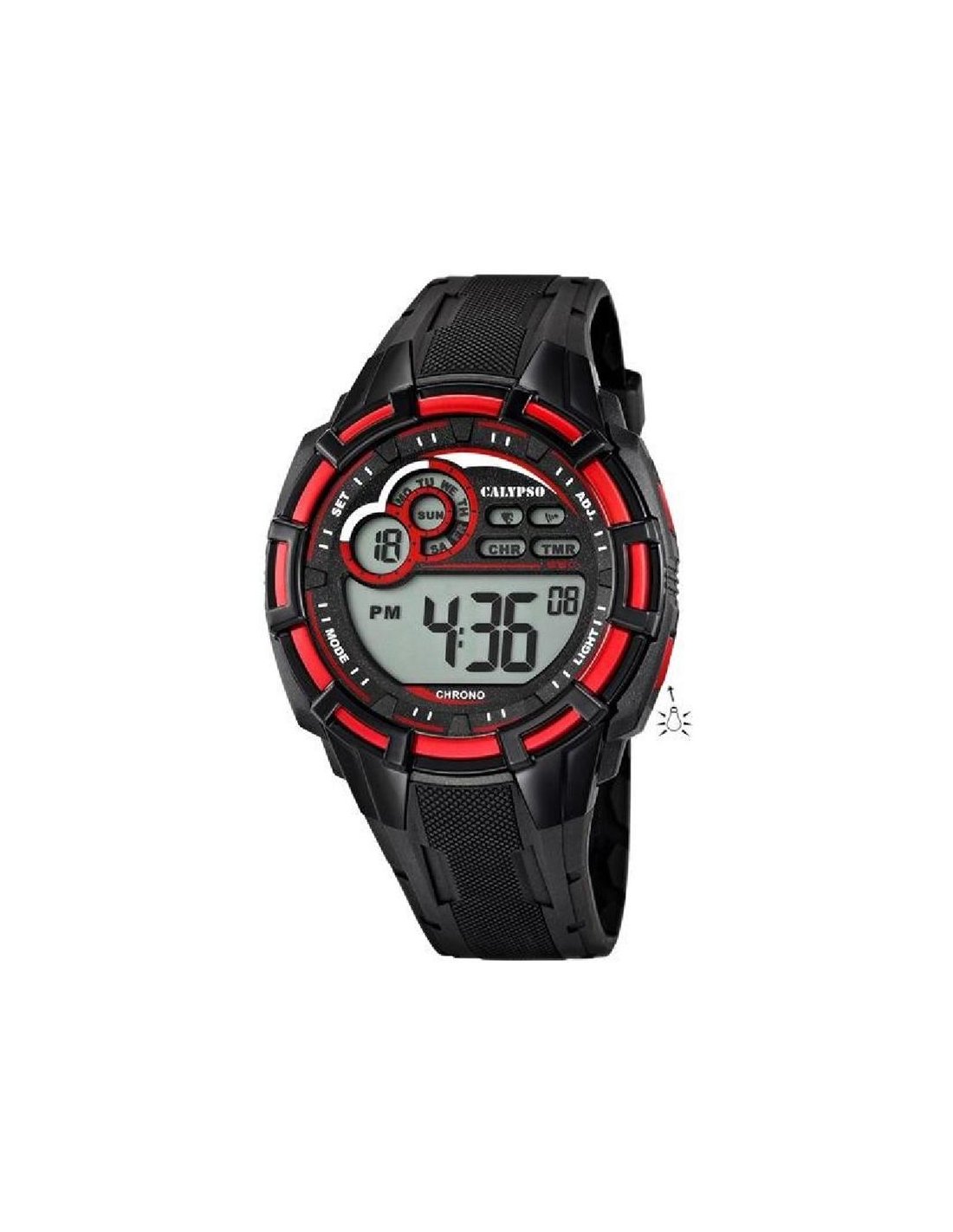 Reloj Calypso para hombre fabricado en caucho color negro con detalles en color rojo. Se trata de un reloj de diseño deportivo compuesto por caja de plástico endurecido de 45mm de diámetro con mecanismo digital protegido por cristal mineral. Su correa es de caucho en color negro con cierre de hebilla. Resistente al agua hasta 100 metros.