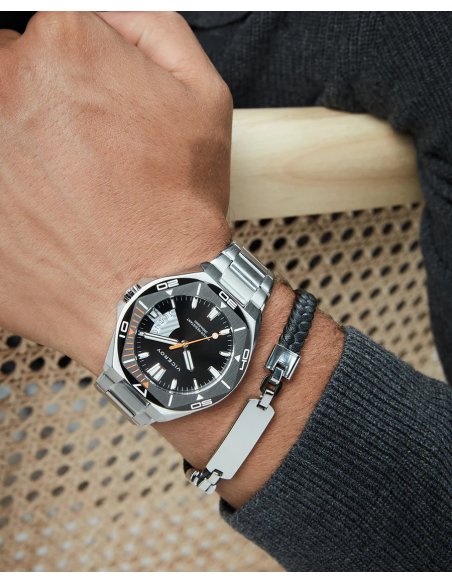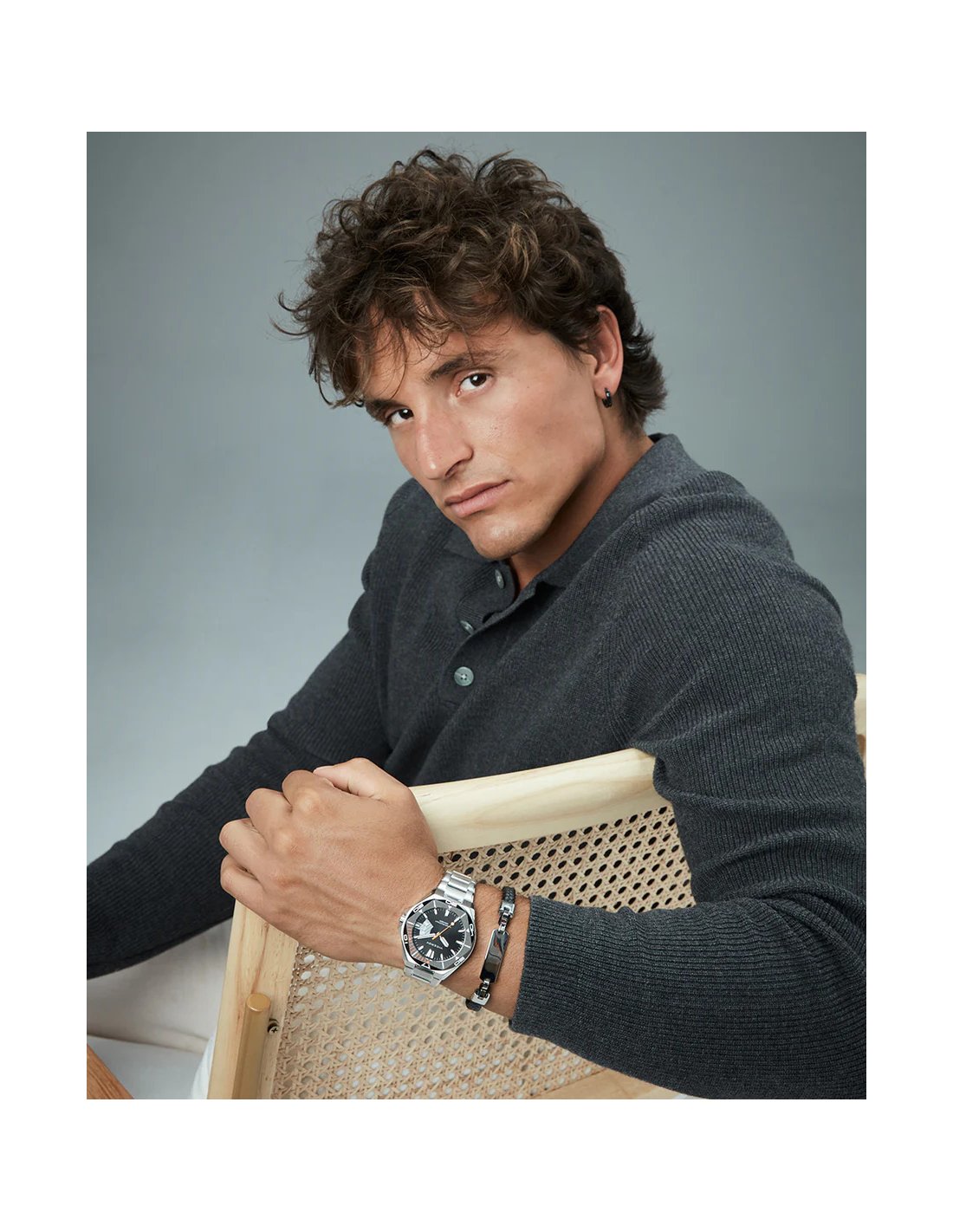 Una pulsera que destaca por su diseño audaz y elegante. Fabricada en acero con acabado IP negro, presenta una placa central que añade un toque de distinción, mientras que la piel trenzada negra ofrece un contraste sofisticado y atemporal. Su combinación de materiales crea una pieza robusta y moderna, perfecta para hombres que buscan un accesorio que combine fuerza y estilo. Con un largo de 21,5 cm, se ajusta cómodamente a la muñeca, convirtiéndola en un complemento ideal para cualquier ocasión. Una joya pensada para aquellos que valoran el diseño contemporáneo con un toque de sofisticación.
