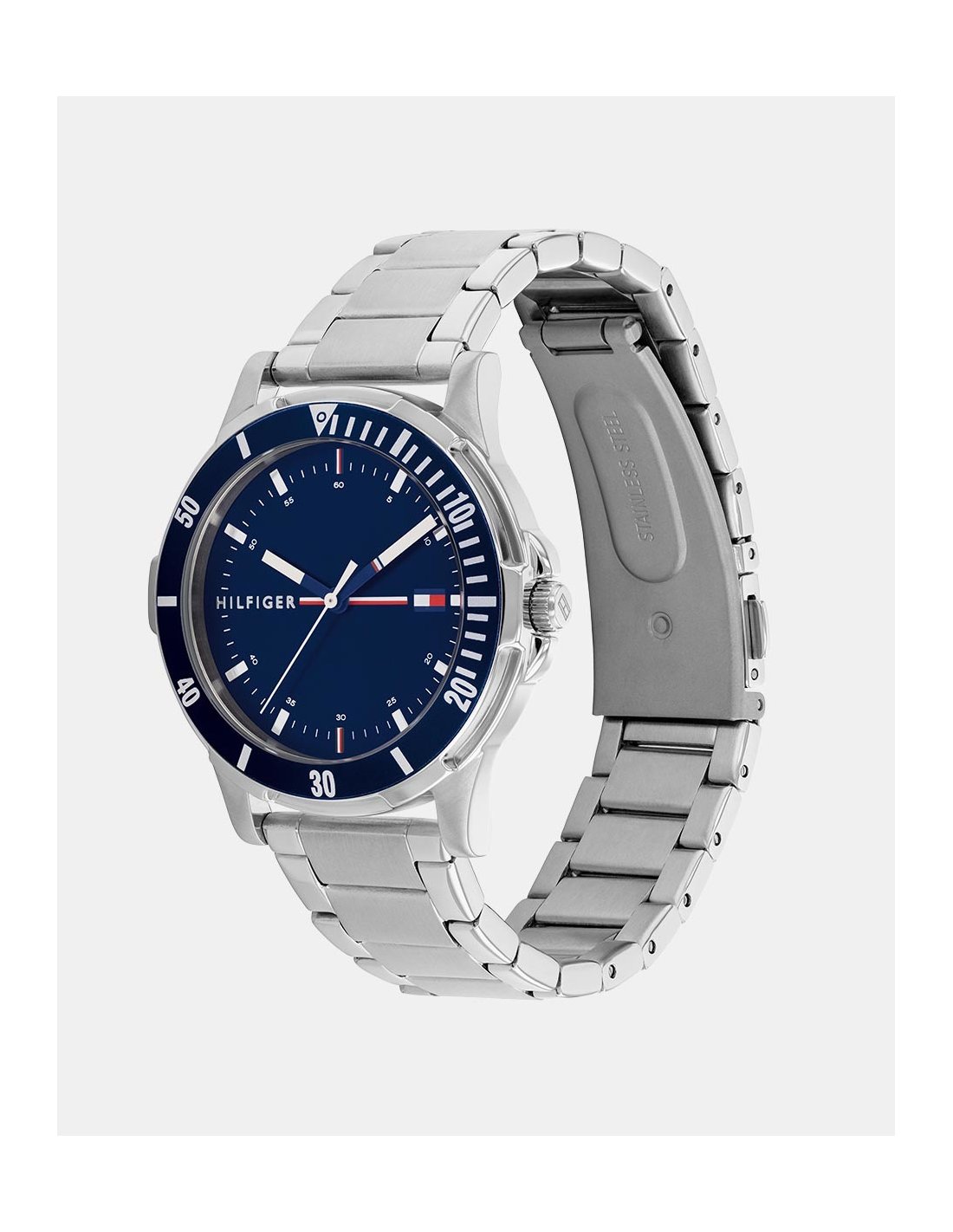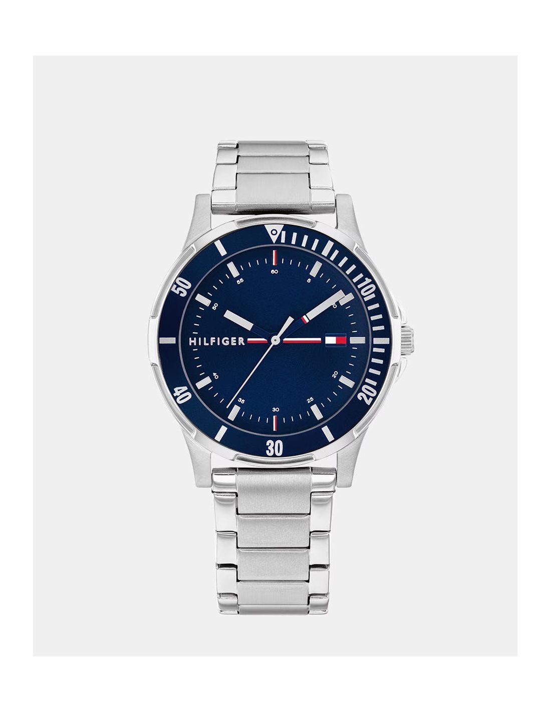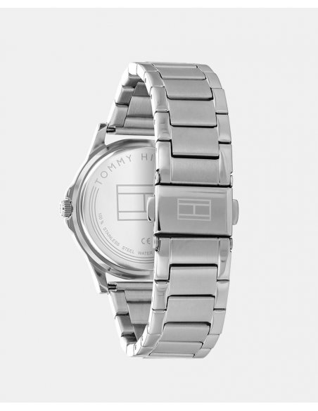 Reloj con caja de acero inoxidable con bisel IP azul, esfera azul tornasolada con índices lineales y movimiento tres agujas. Brazalete de eslabones en acero inoxidable plateado.