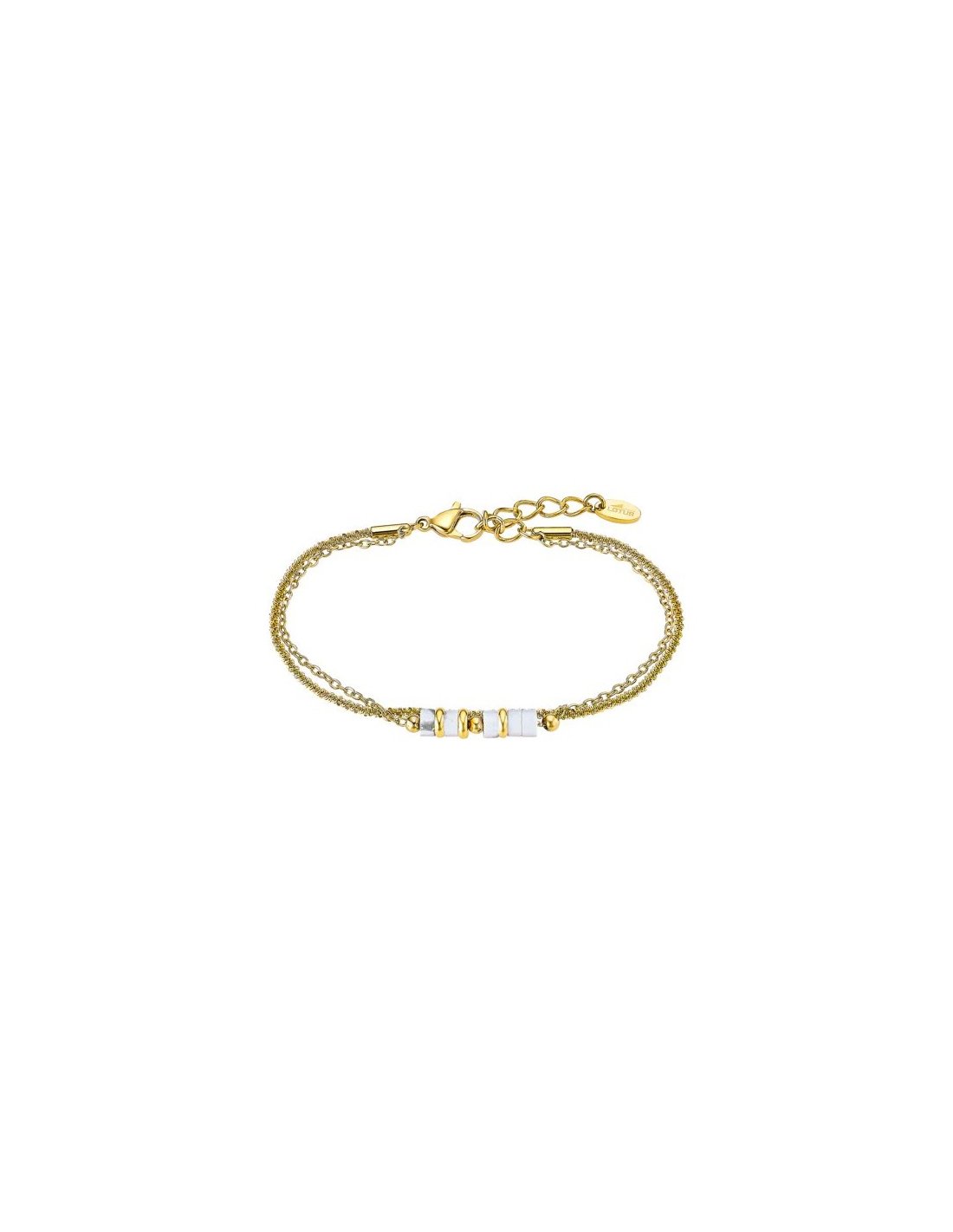 Pulsera Lotus Style para mujer fabricada en acero bañado en oro amarillo compuesta por una doble cadena con piezas tubulares plateadas en su parte central. Su cierre es de mosquetón ajustable mediante cadena extensible.