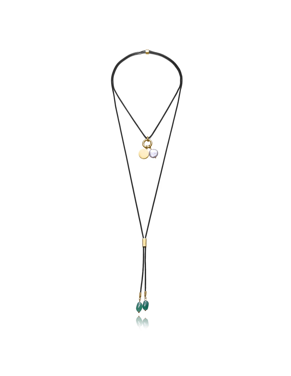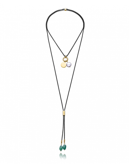 Este exclusivo collar de acero Ip negro y dorado de la colección Laura Escanes aporta un diseño moderno y elegante. Con una cadena ajustable de 125 cm, se adapta perfectamente a diferentes estilos y preferencias. El colgante de perla natural removible junto con las dos piedras naturales colgantes fijas crean una pieza única, que destaca por su sofisticación y naturalidad. Ideal para quienes buscan un toque de lujo y distinción en su look diario o en ocasiones especiales. Largo 125 cm.