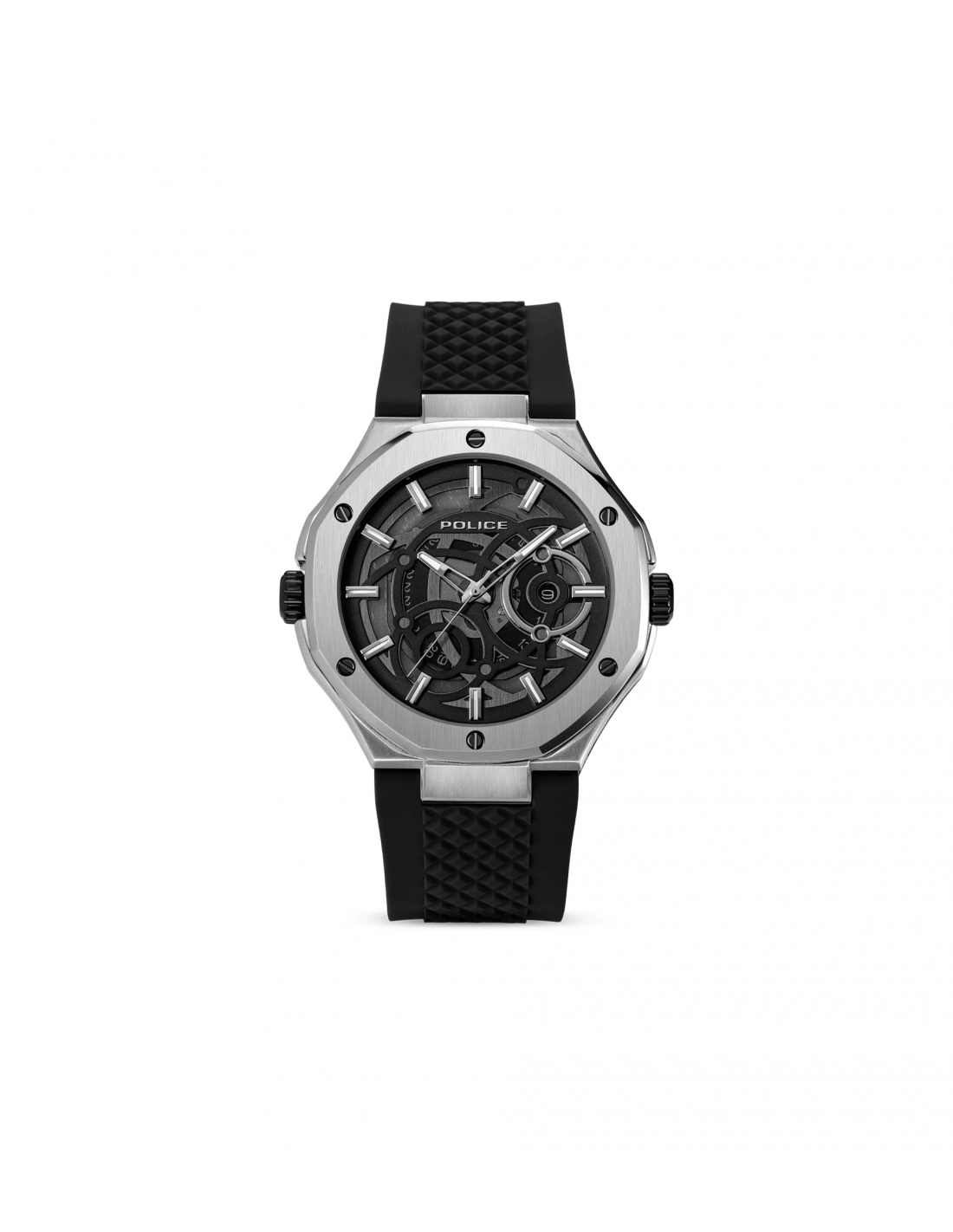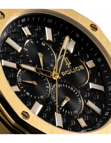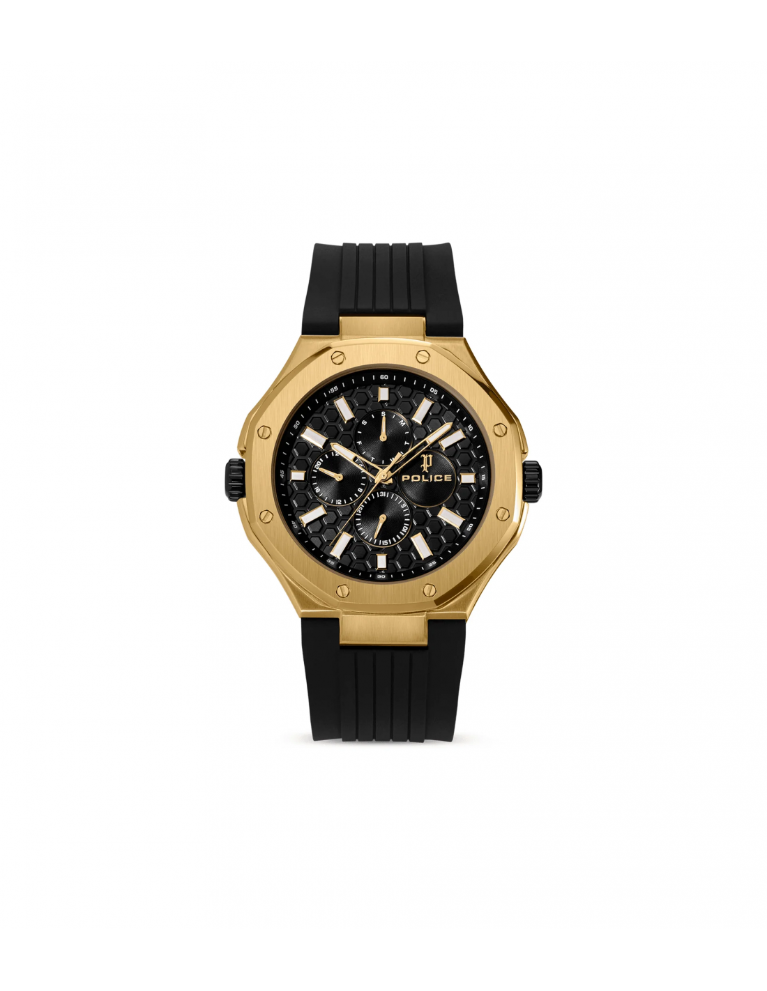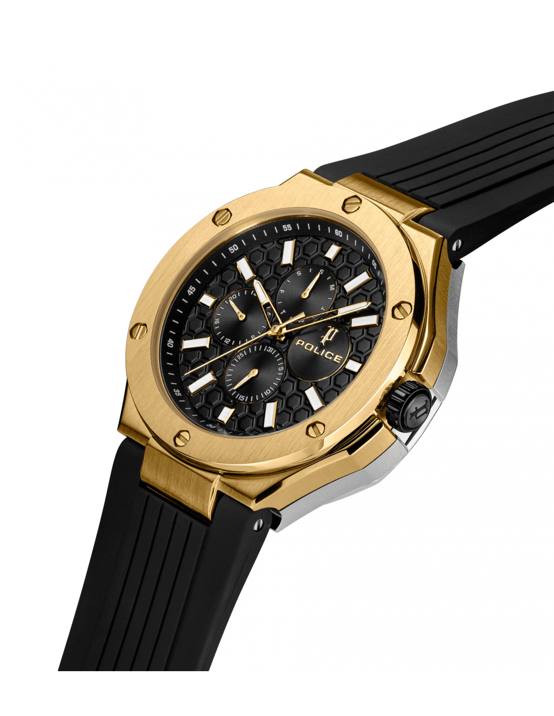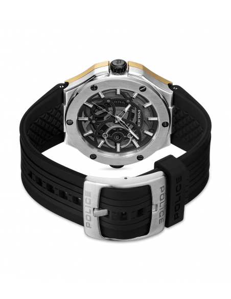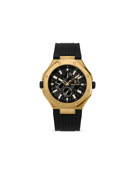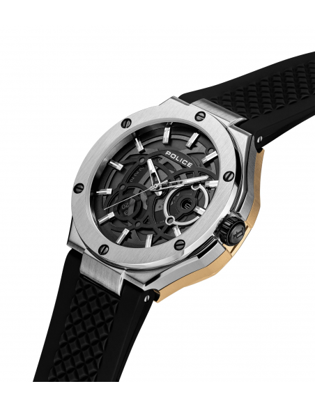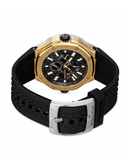 Dos relojes, una declaración desafiante. La DUAL es una máquina de doble dial con personalidades divididas: un dial ofrece la clásica precisión de 3 manecillas, el otro dispara en todos los ángulos con total intensidad multifunción. Ambos alojados en una caja de acero inoxidable de 44x53 mm, blindada en acero cepillado y pulido y oro chapado en iones. Una esfera enmarcada por un bisel dorado esculpido y la otra por un acero circular minimalista: un contraste con carácter. La silicona negra envuelve la muñeca, asegurando la comodidad sin suavizar el borde.
