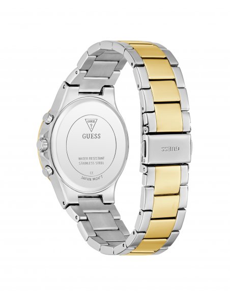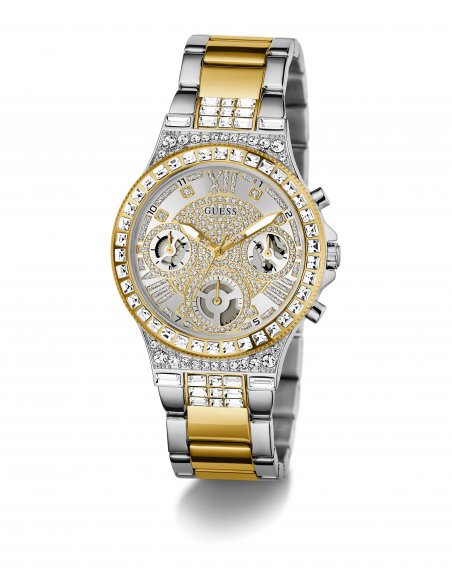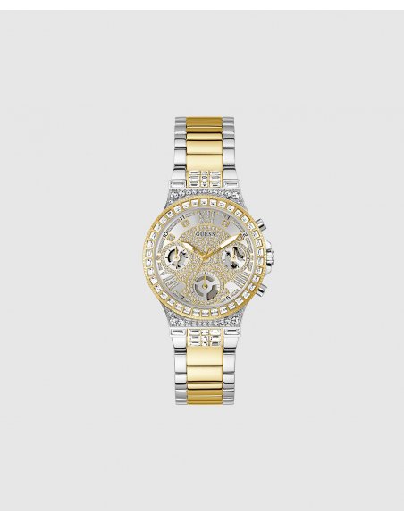 Reloj de mujer Moonlight GW0320L7 de acero y correa bicolor oro. Reloj de mujer de la marca Guess con caja de acero reciclado brillante de 36 mm bicolor dorado y palteado con cristales blancos, esfera multifunción de iridiscente bicolor dorado y plateado con detalles brillantes y brazalete de acero brillante bicolor dorado y plateado con cristales blancos. Brilla como a la luz de la luna con este reloj deslumbrante, con caja llena de cristales y una esfera glamurosa que no pasa desapercibida.
