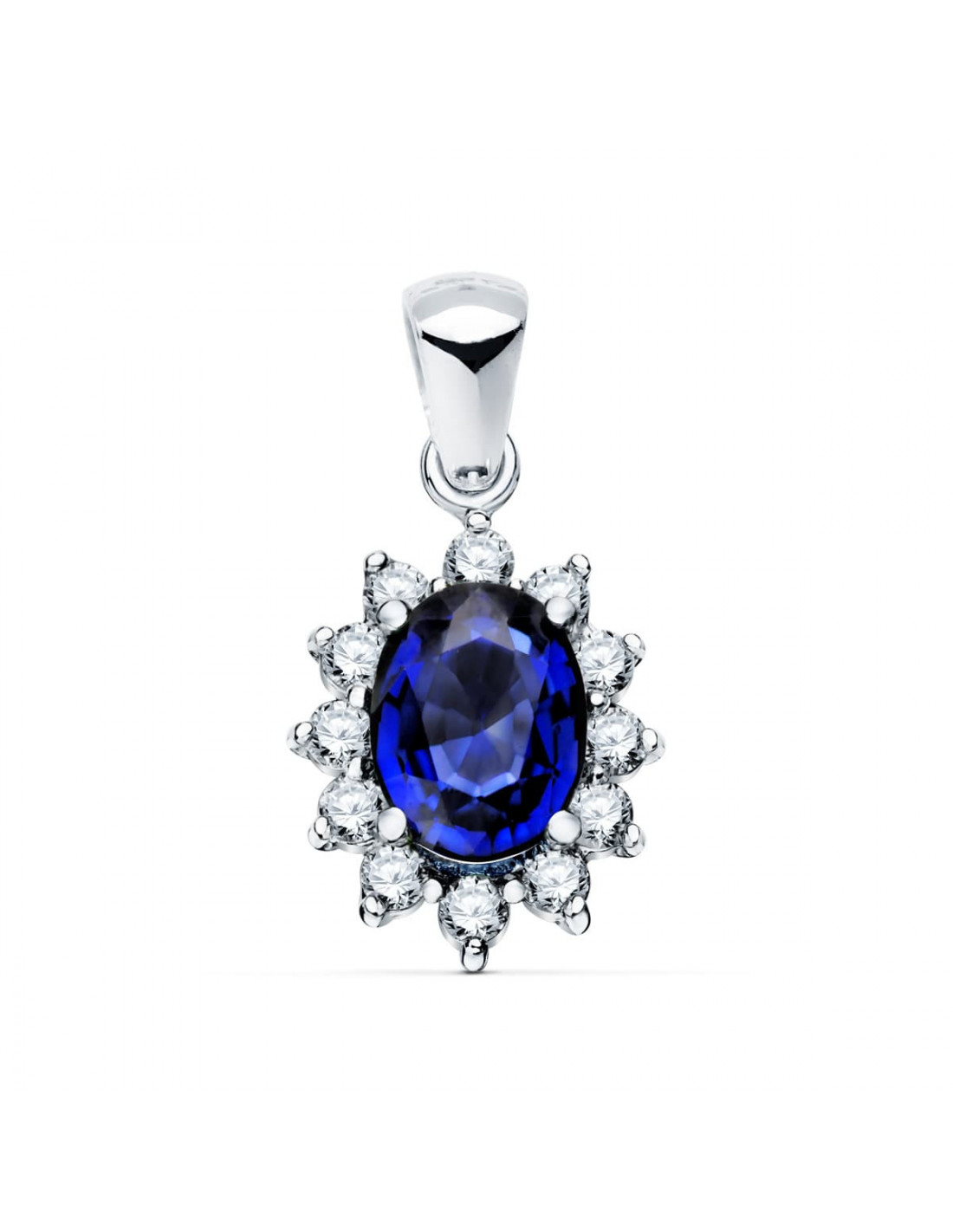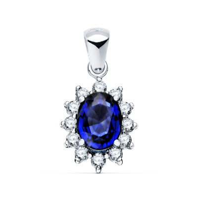 18K COLGANTE ORO BLANCO ZAFIRO 0.98 QT. 12 DIAMANTES 0.35 QTS. SI-H. 13X11 MM