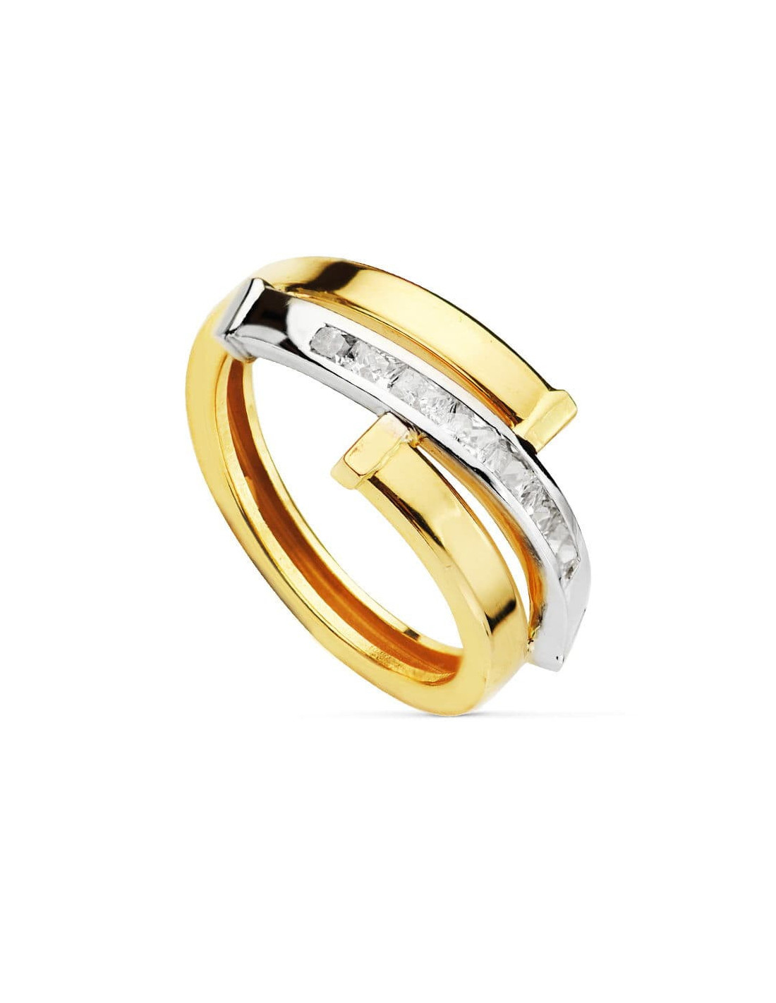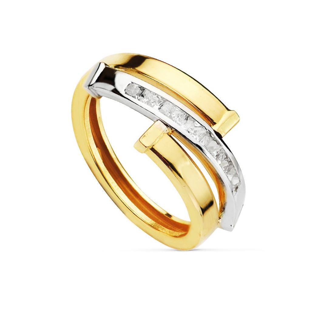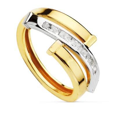 9K SORTIJA ORO BICOLOR BANDAS CON CIRCONITAS EN CARRIL