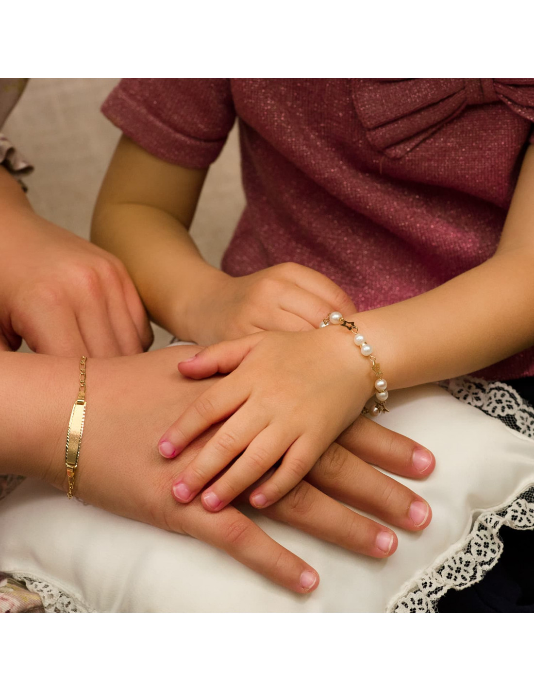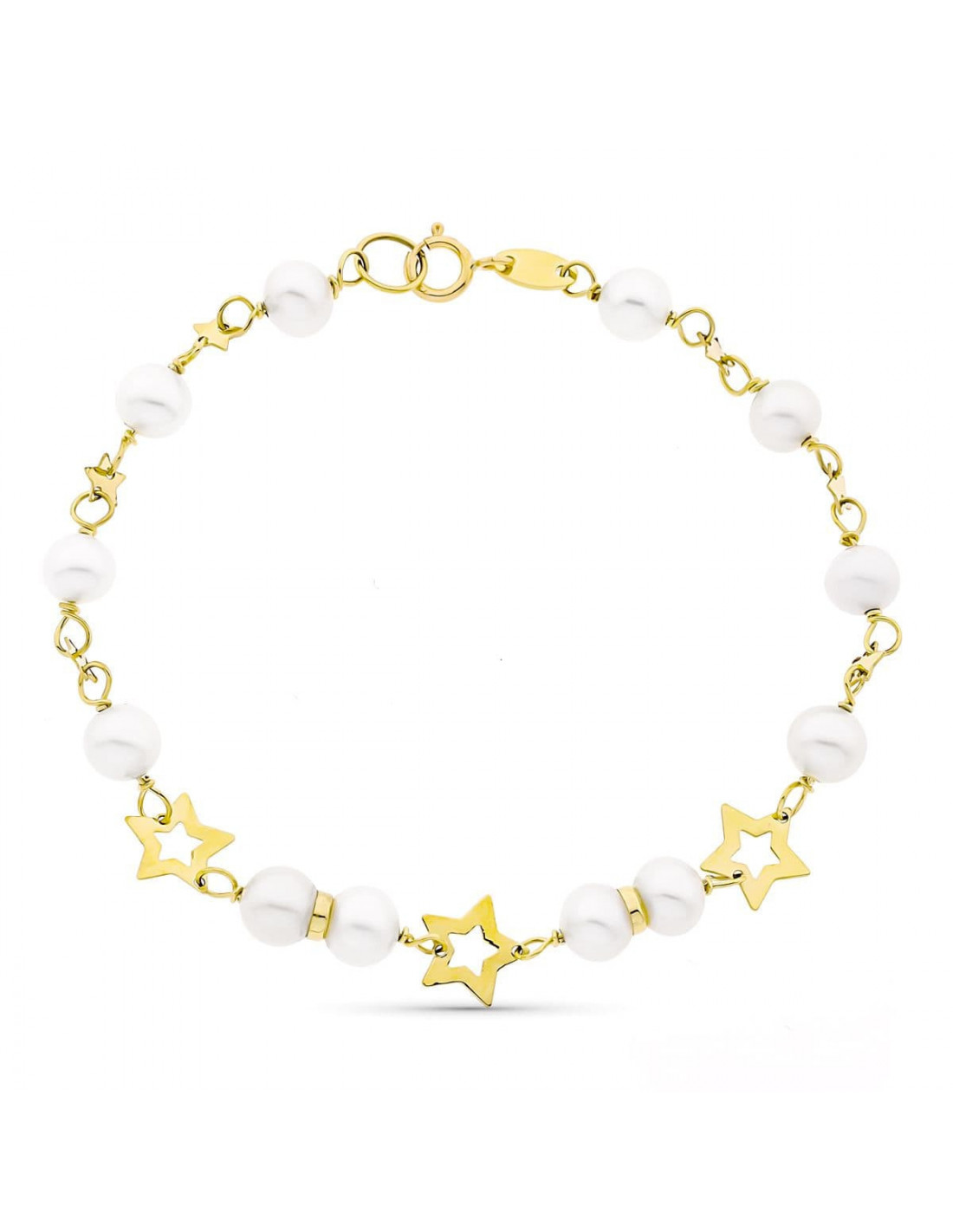 9K PULSERA ORO AMARILLO CON PERLA DE 5 MM Y ESTRELLAS CALADAS. 17 CM