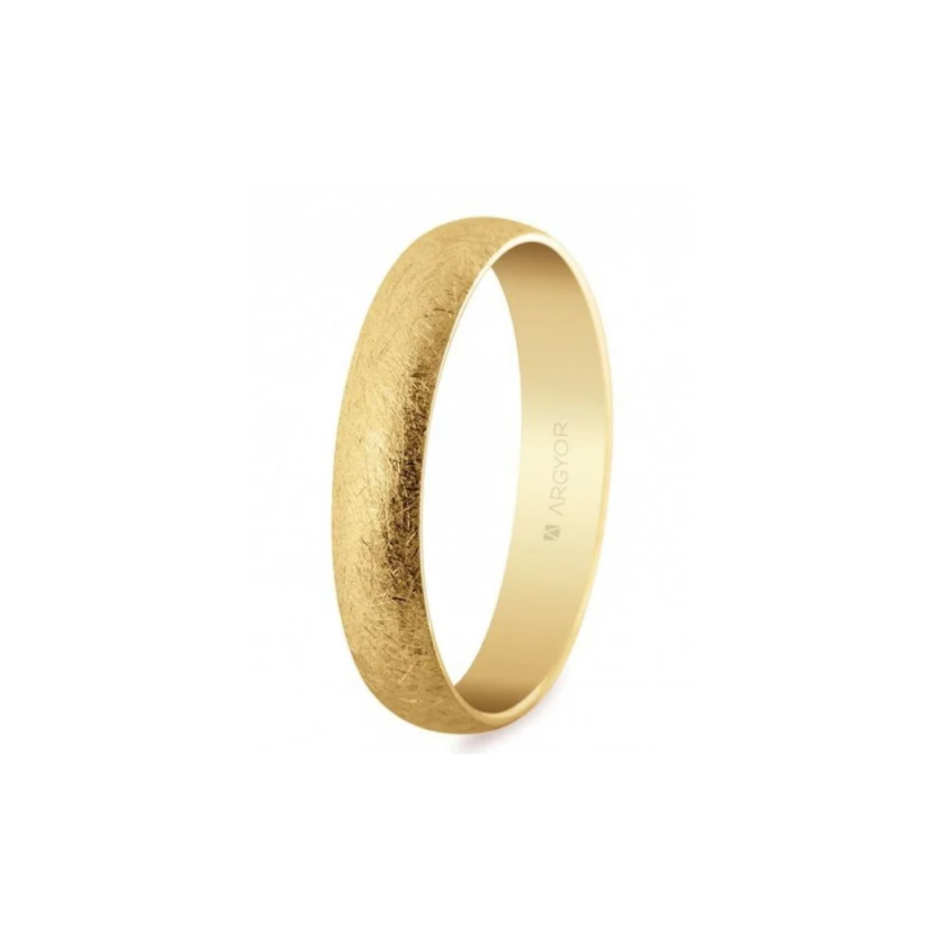 Alianza de boda media caña clásica de oro de 18K modelo 50405H de 4 mm de ancho. Cuenta con un acabado efecto hielo y un interior plano. A esta alianza se le puede añadir un diamante talla brillante de 0.02ct color H, pureza SI.