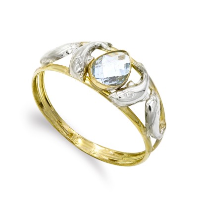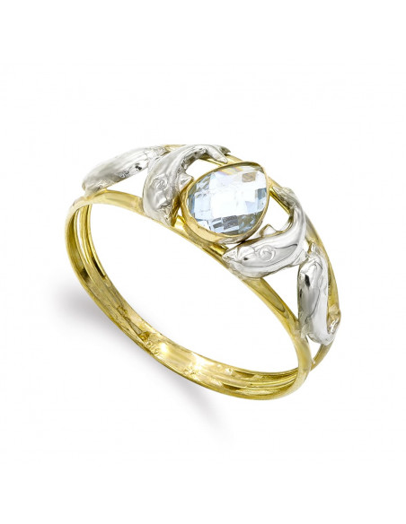 9K SORTIJA BICOLOR PIEDRA AGUAMARINA Y DELFINES