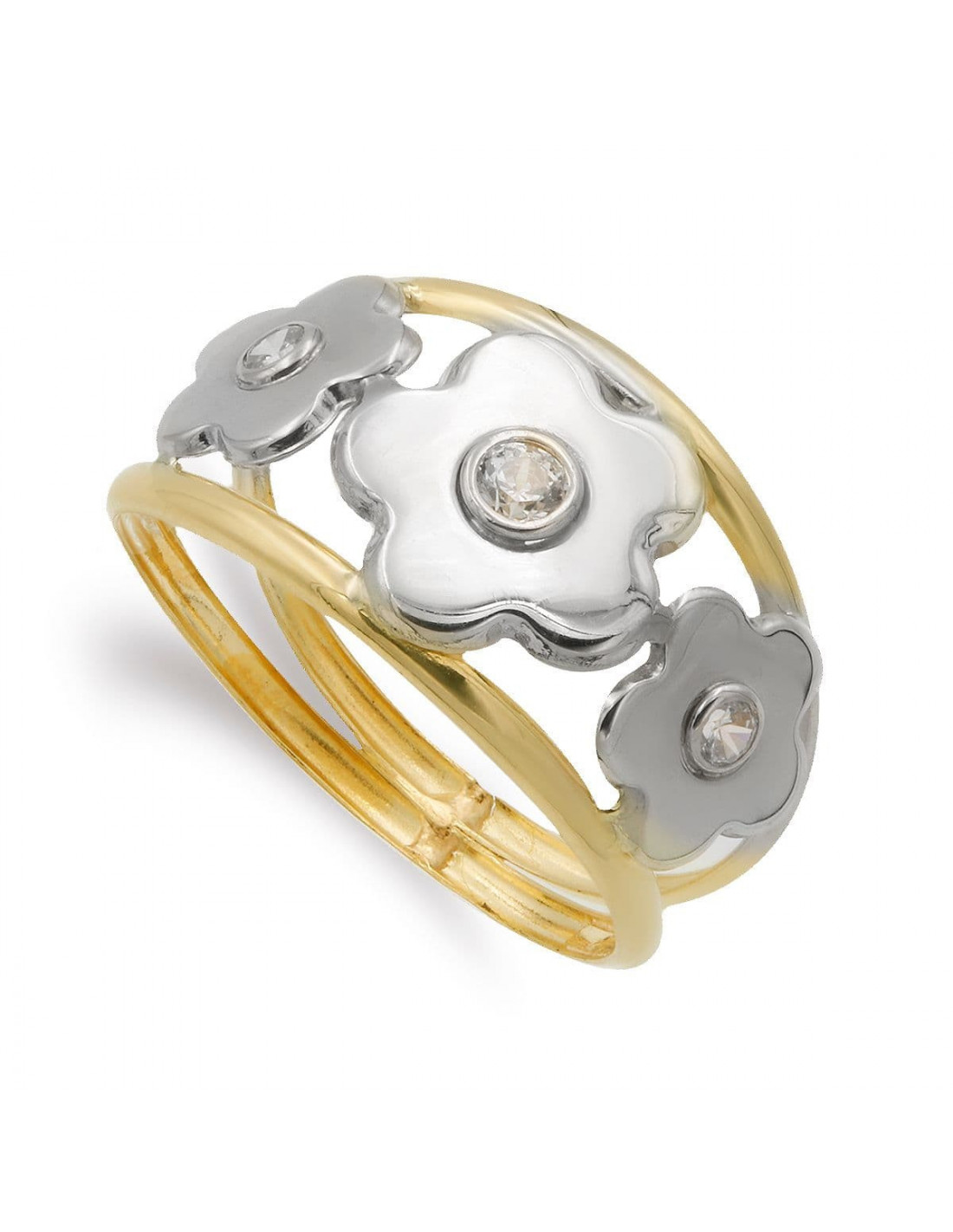 9K SORTIJA ORO BICOLOR CON FLORES Y CIRCONITAS