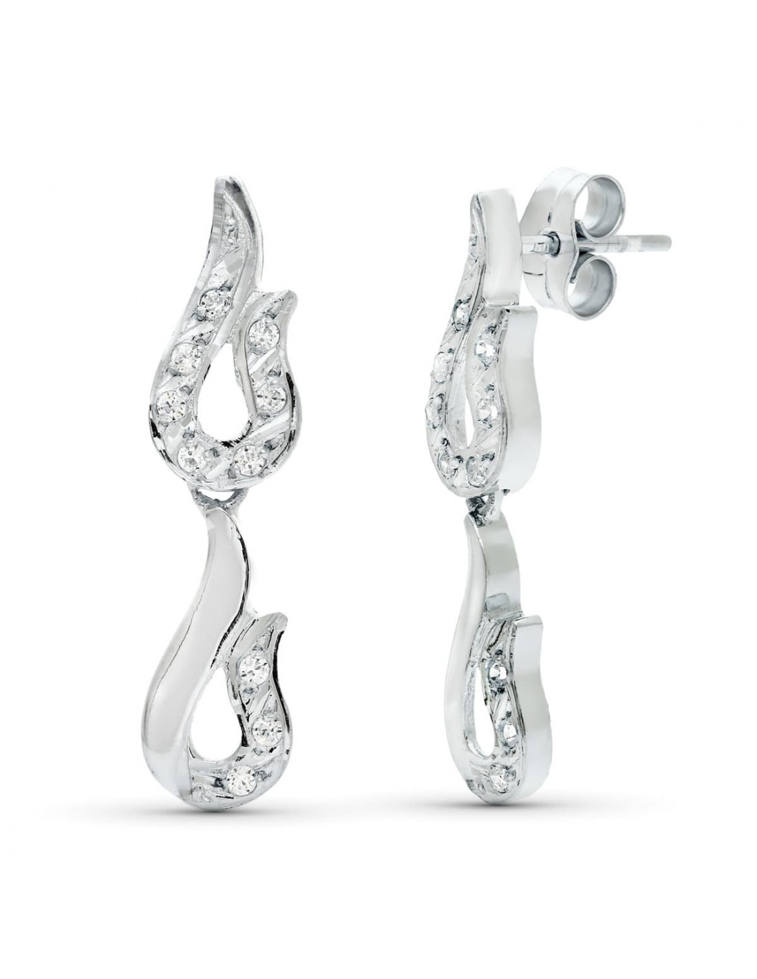 18K PENDIENTES ORO BLANCO JUEGO NOVIA DOBLE CUERPO CIRCONITAS 26X7 MM PRESION
