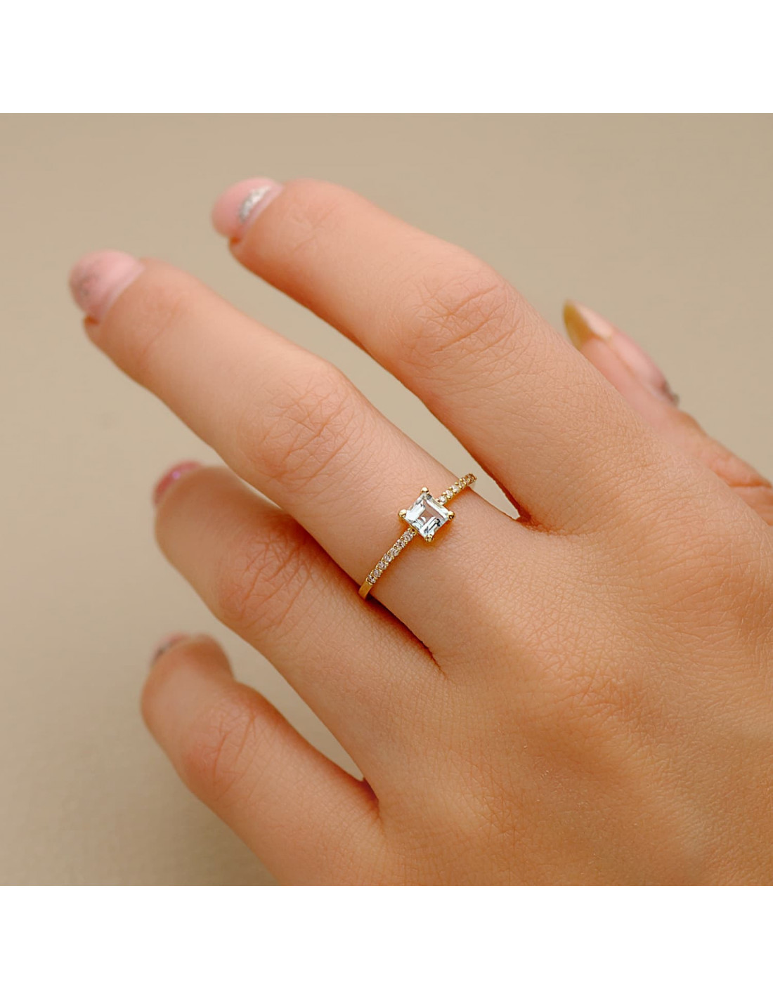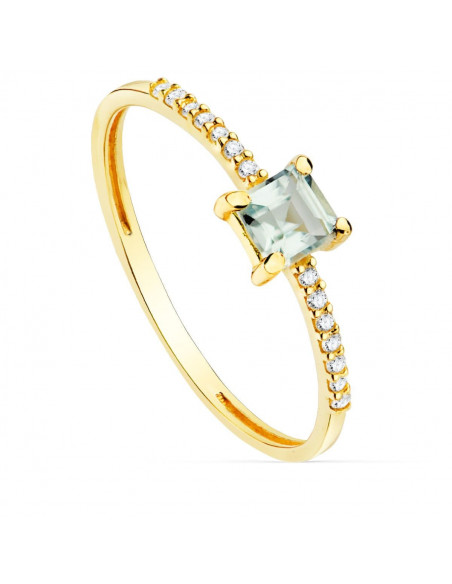 SORTIJA ORO AMARILLO 14 DIAMANTES 0.070 QTS. G-VS2 AGUAMARINA 4X4 MM ANCHO 1 MM