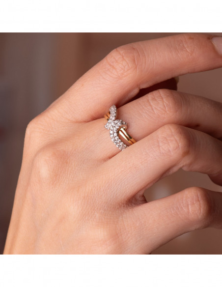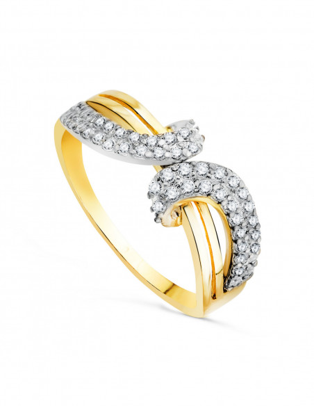 18K SORTIJA ORO BICOLOR CALADA CON MOTIVO CRUZADO DE CIRCONITAS. ANCHO 8MM
