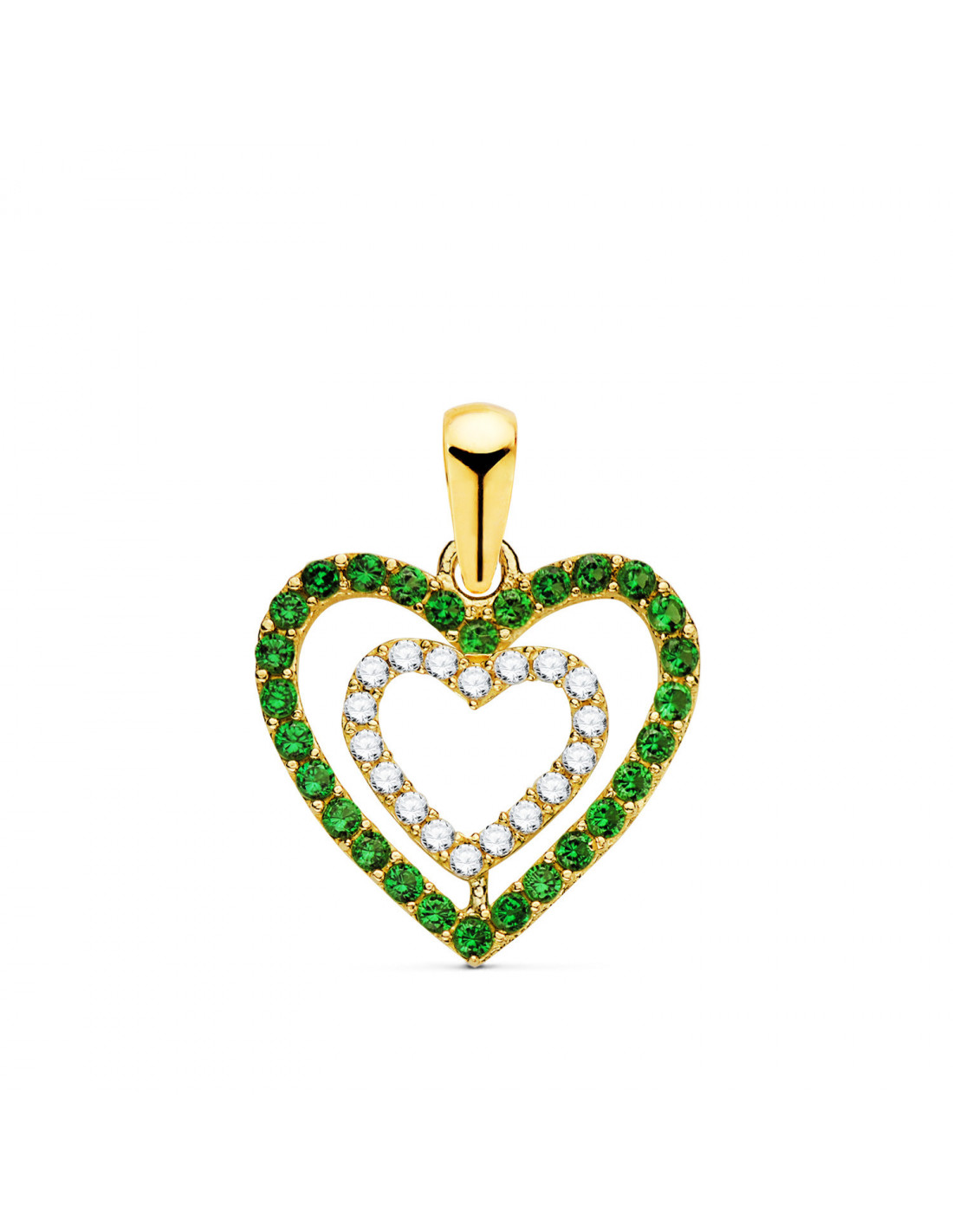 18K COLGANTE ORO AMARILLO CORAZONES CON CIRCONITAS VERDES Y BLANCAS 15 X 14MM