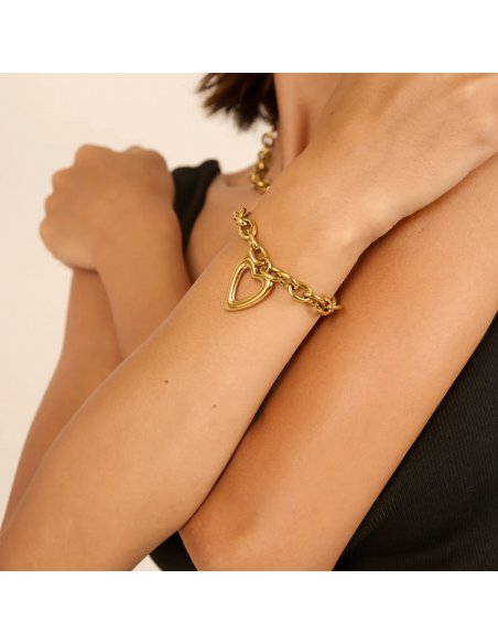 a pulsera Hearts dorada para mujer es una joya que refleja fuerza, dulzura y estilo contemporáneo. Su diseño se compone de eslabones redondeados en acero inoxidable con acabado dorado brillante, aportando presencia visual y elegancia a partes iguales. El centro de la pulsera se enmarca con un colgante en forma de corazón hueco, símbolo universal de amor y conexión emocional. Esta pieza, perteneciente a la colección Hearts de Radiant, es perfecta para mujeres que buscan un accesorio llamativo pero sofisticado. La estructura de la pulsera permite un ajuste cómodo gracias a su cierre tipo mosquetón y su pequeña cadena extensora. Se puede lucir como pieza única o combinada con otras joyas doradas para crear un estilo más personalizado. Su diseño robusto pero femenino la convierte en un complemento ideal tanto para el día a día como para eventos donde quieras destacar. Es una declaración de intención: femenina, fuerte y auténtica. Una joya que no solo decora, sino que transmite emoción y personalidad.
