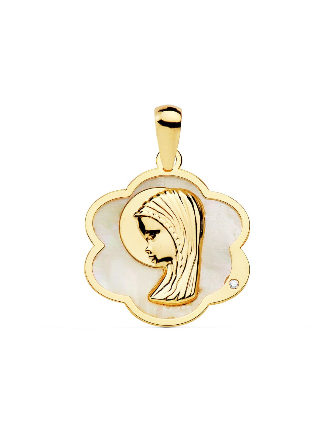 18K MEDALLA ORO AMARILLO FLOR CON VIRGEN NIÑA NACAR 18X17 MM
