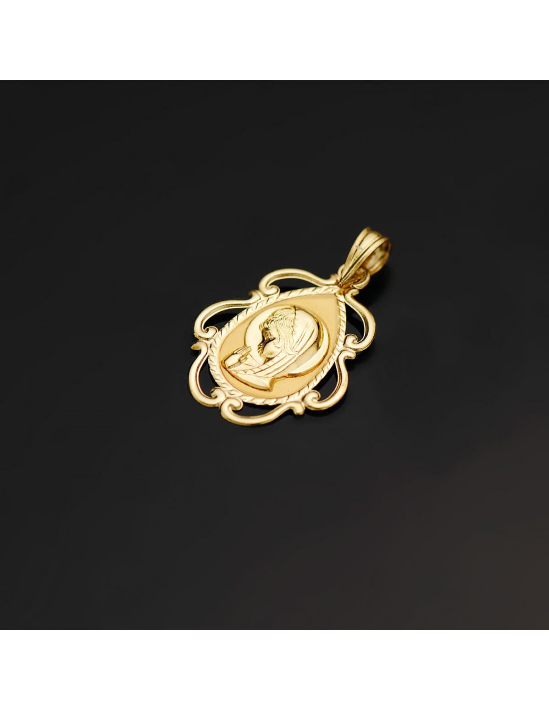 18K MEDALLA VIRGEN NIÑA CERCO CALADO EN BRILLO . 22 X 16 MM