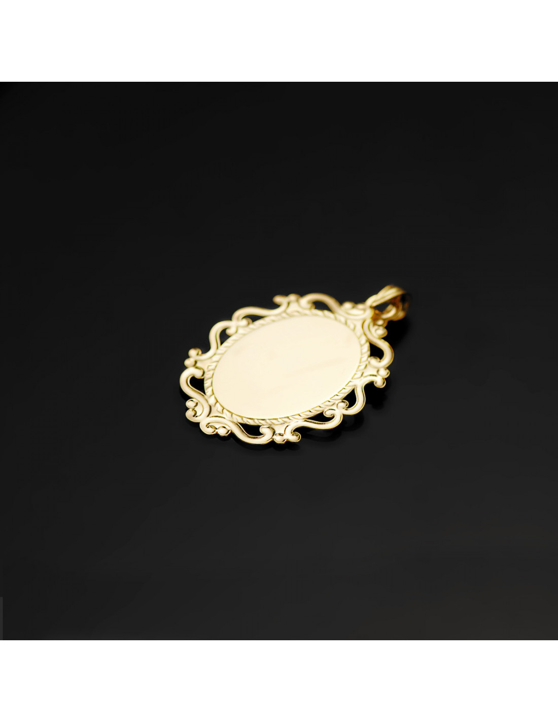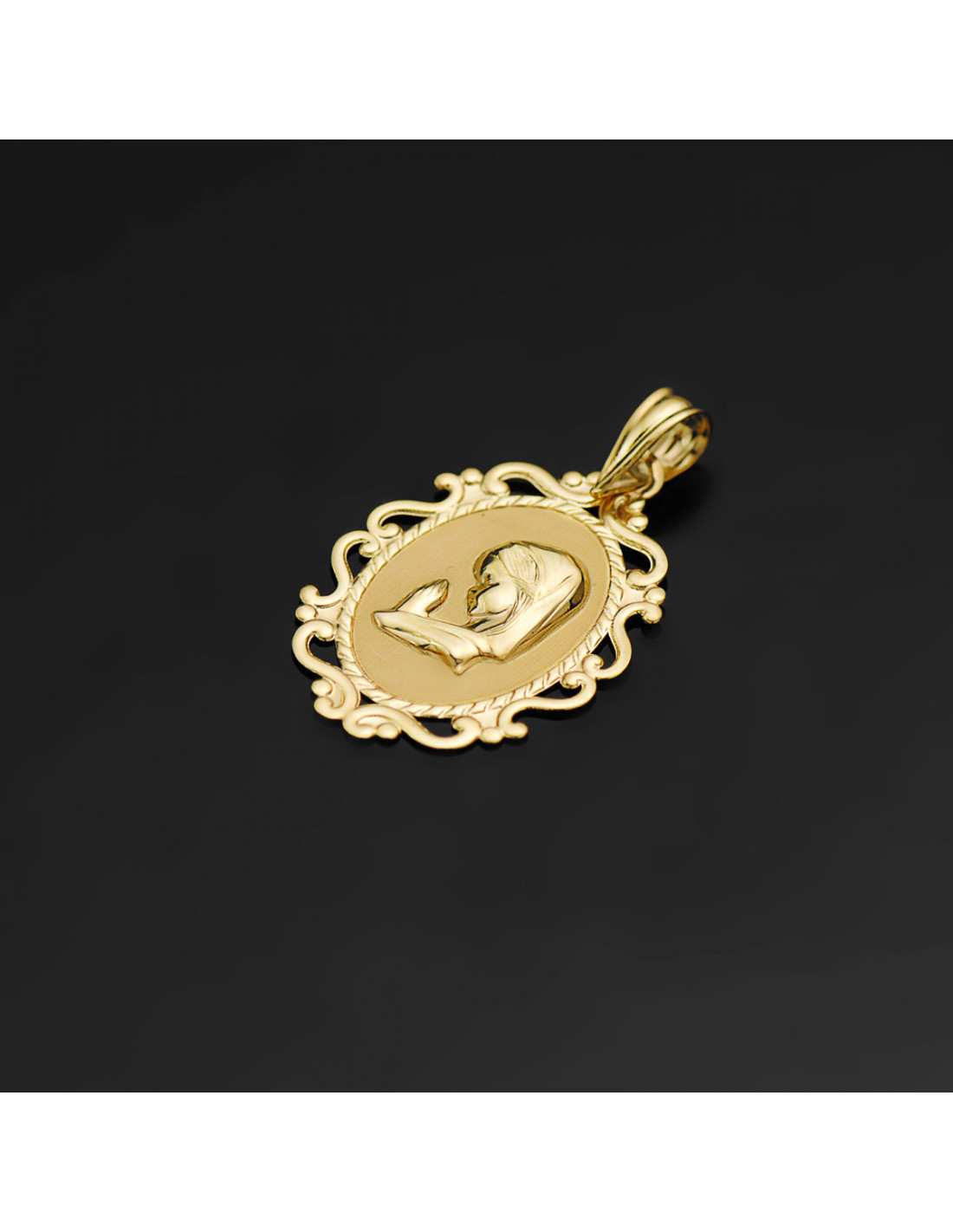 18K MEDALLA VIRGEN NIÑA PERFIL CERCO CALADO BRILLO. 23 X 16 MM