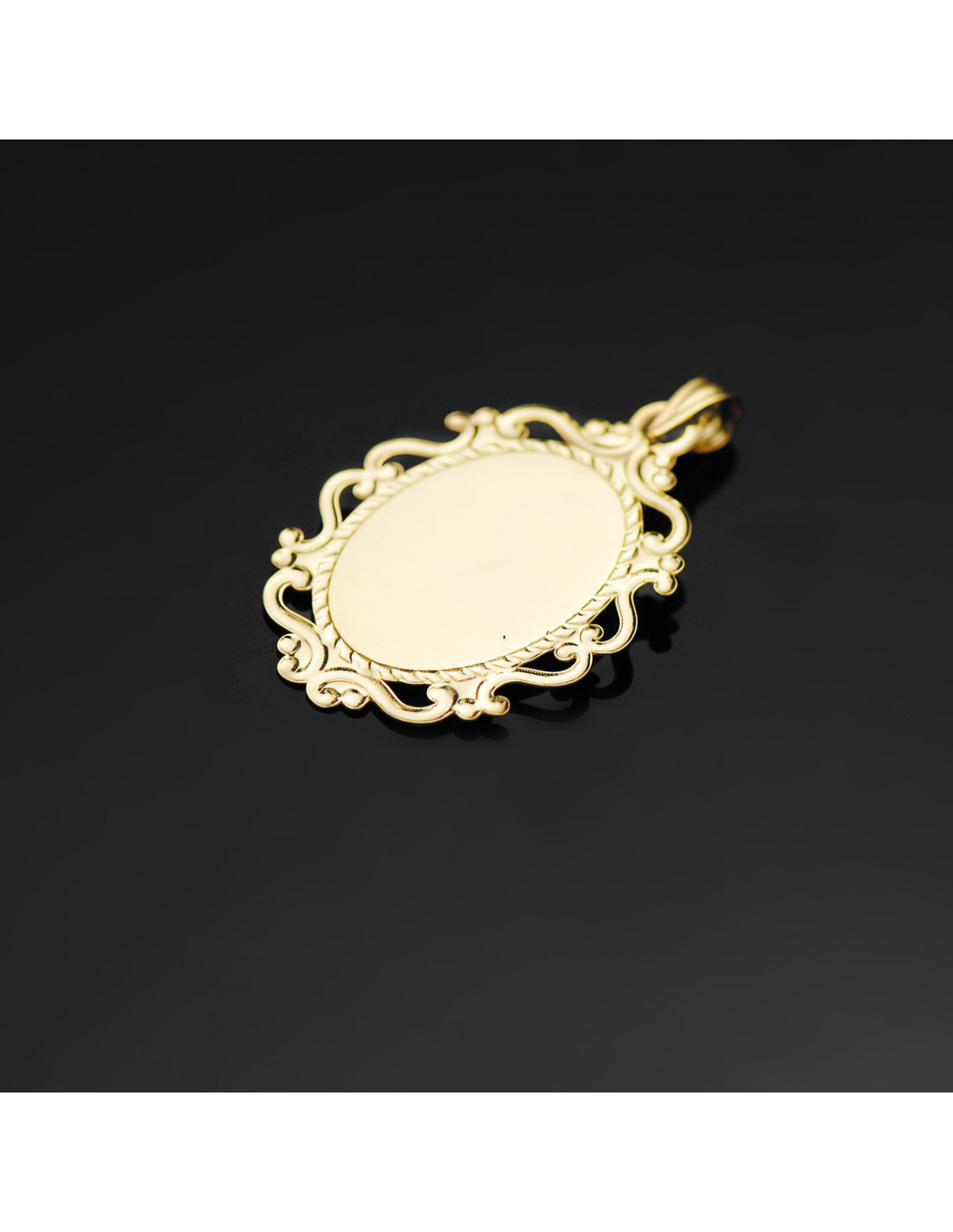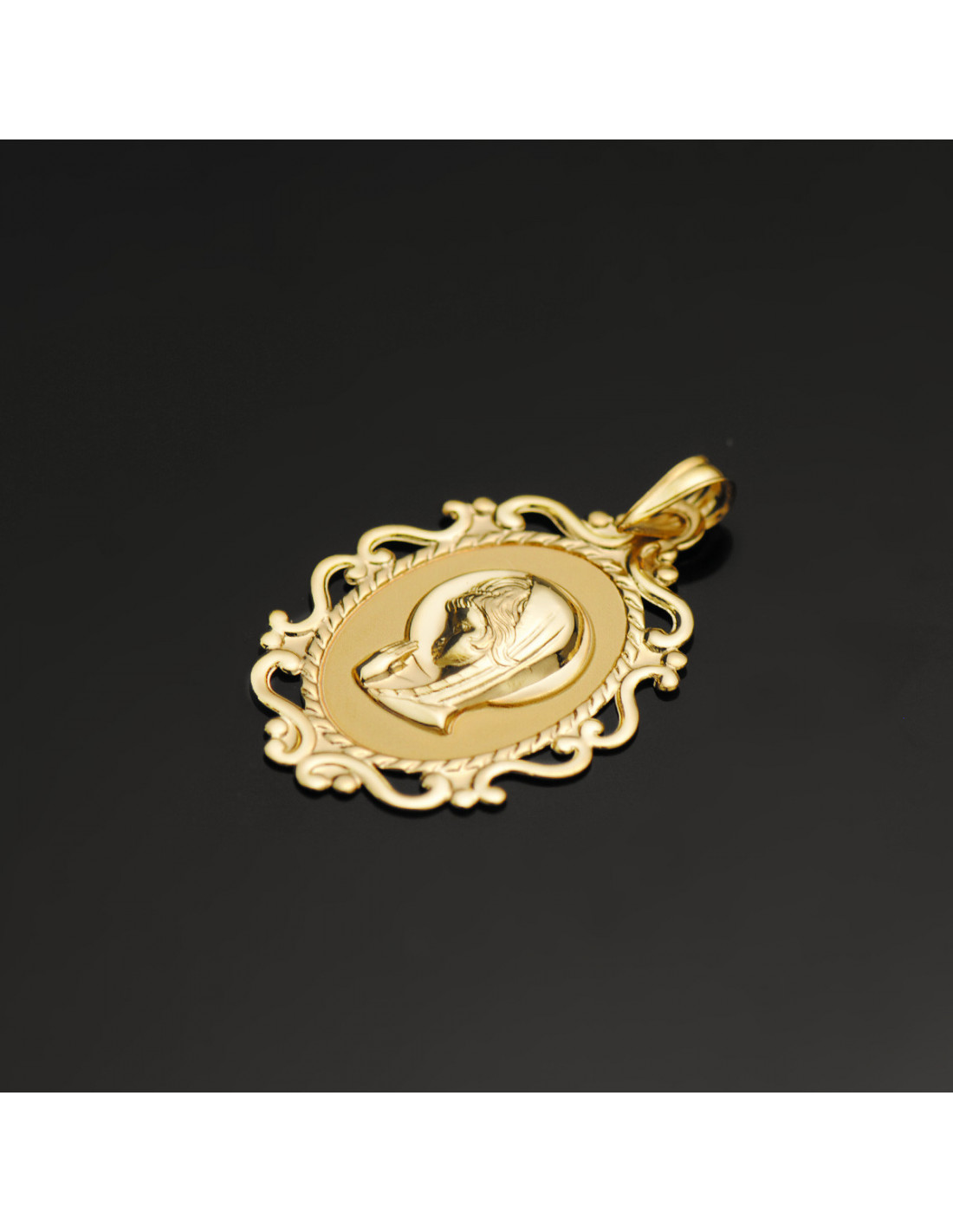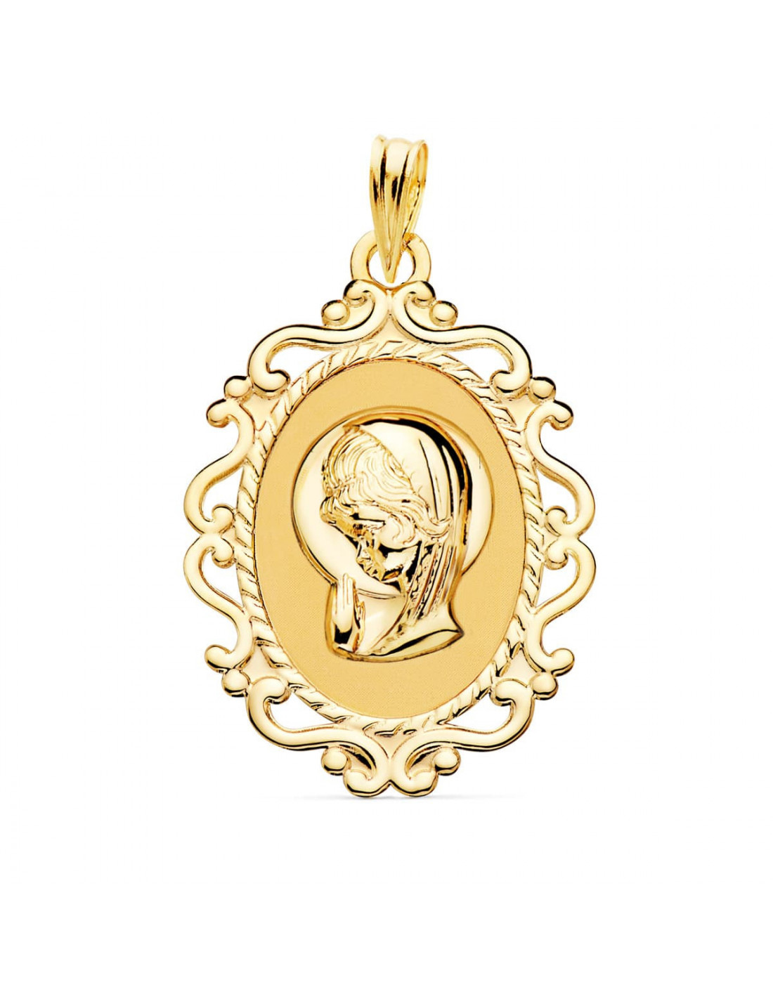 18K MEDALLA VIRGEN NIÑA CERCO CALADO EN BRILLO 31X21 MM