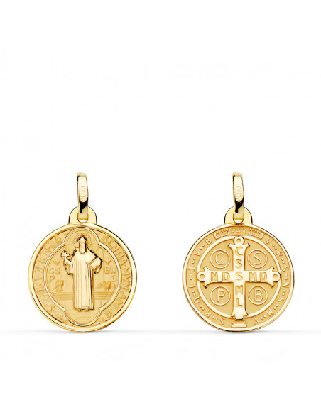 18K MEDALLA ESCAPULARIO SAN BENITO MONJE BRILLO Y FONDO MATIZADO 16 MM