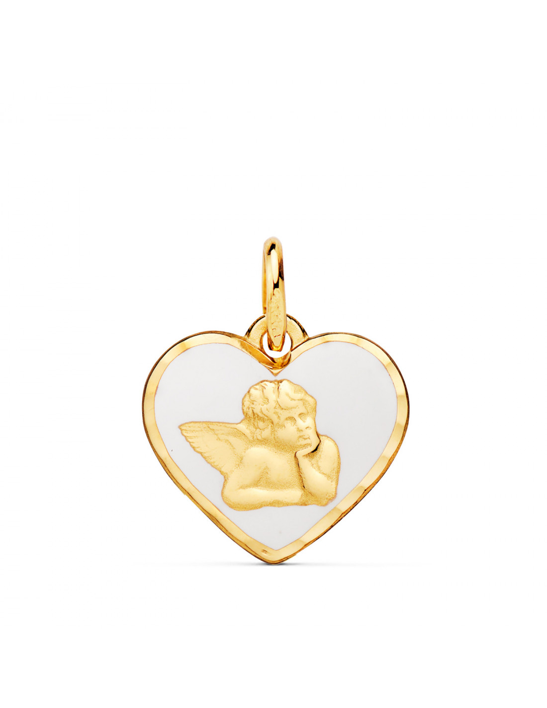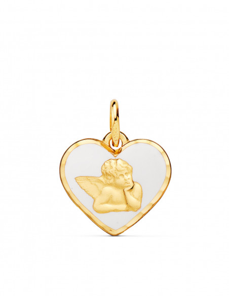18K MEDALLA ORO AMARILLO CORAZON ANGELITO BURLON ESMALTE BLANCO 14 MM