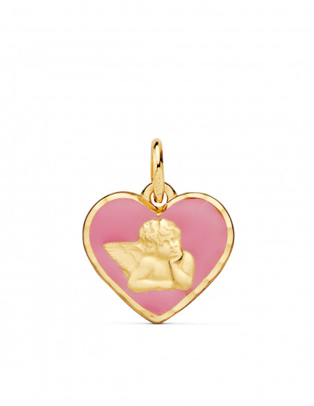 18K MEDALLA ORO AMARILLO CORAZON ANGELITO BURLON ESMALTE ROSA 14 MM