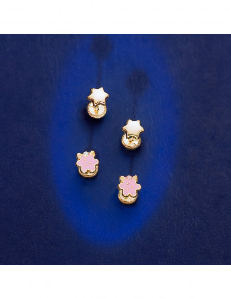 18K PENDIENTES ORO AMARILLO FLOR ESMALTE ROSA CIERRE TUERCA 6,5 X 6,5 MM