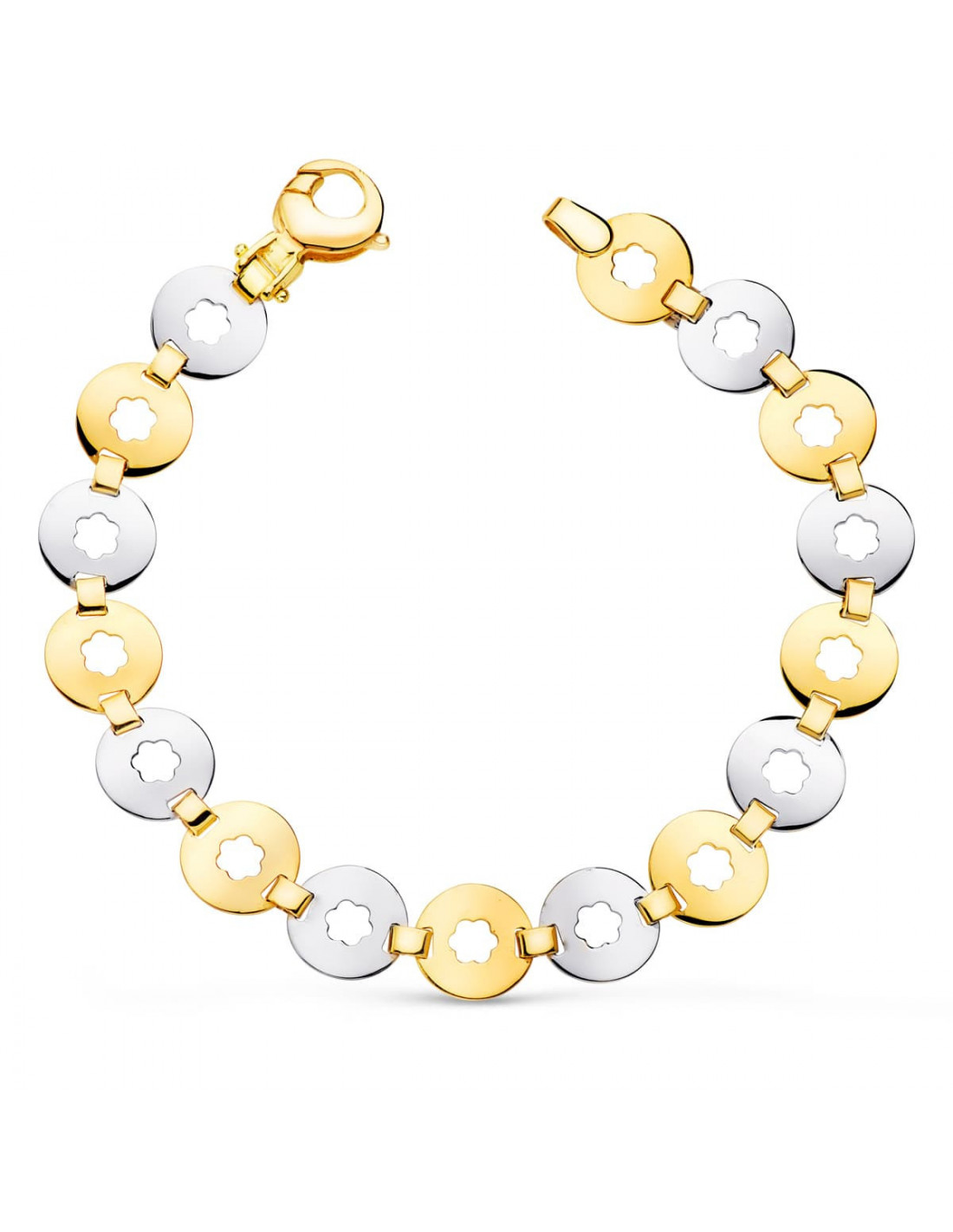 18K PULSERA ORO BICOLOR ESLABONES REDONDOS CON FLOR ANCHO 10 MM LARGO 19 CM