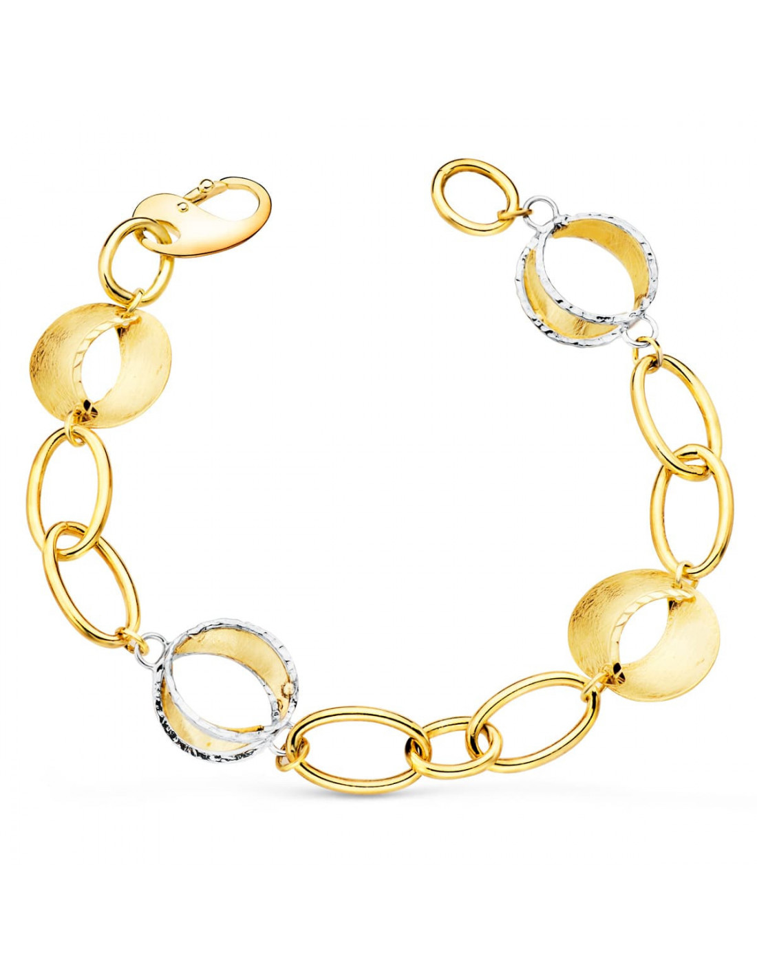 18K PULSERA ORO BICOLOR ESLABONES OVALES Y MOTIVOS REDONDOS RAYADOS. 20 CM