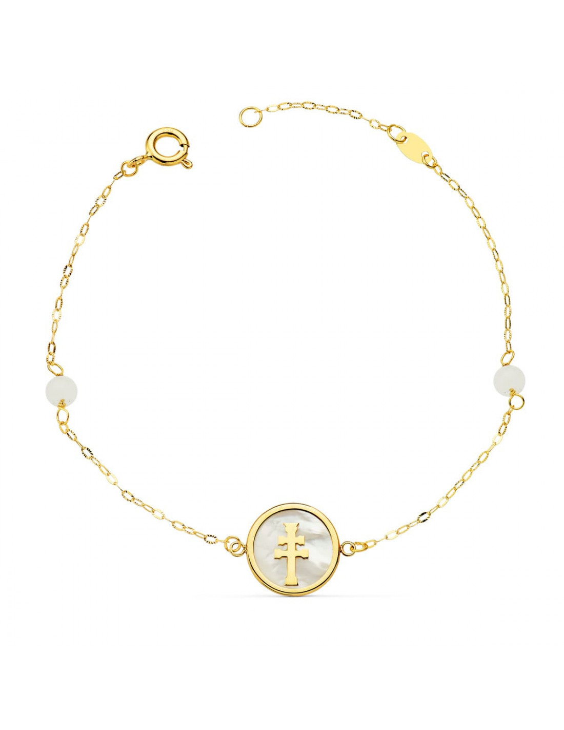 PULSERA NACAR CON CRUZ CARAVACA 12 MM Y BOLAS JADE 4 MM CADENA 18 + 2.5 CM