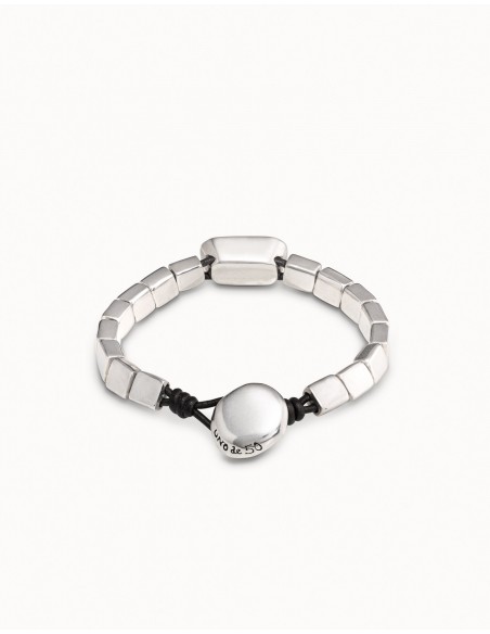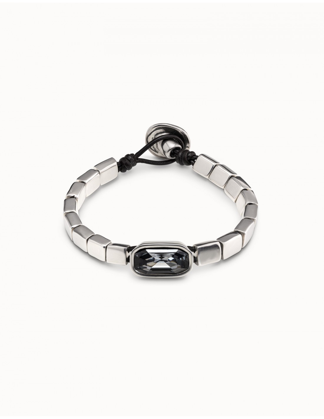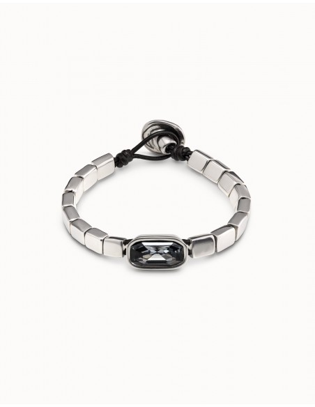 Pulsera formada por una tira de carres medianos y una caja central con un cristal gris. Esta pulsera está realizada de manera completamente artesanal y en España, con una aleación de metales bañados en plata. Consigue esta pulsera que te acompañará allí donde vayas.