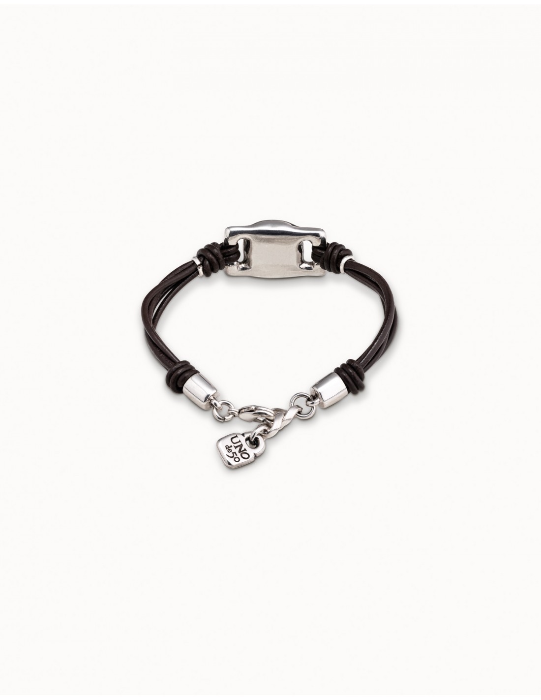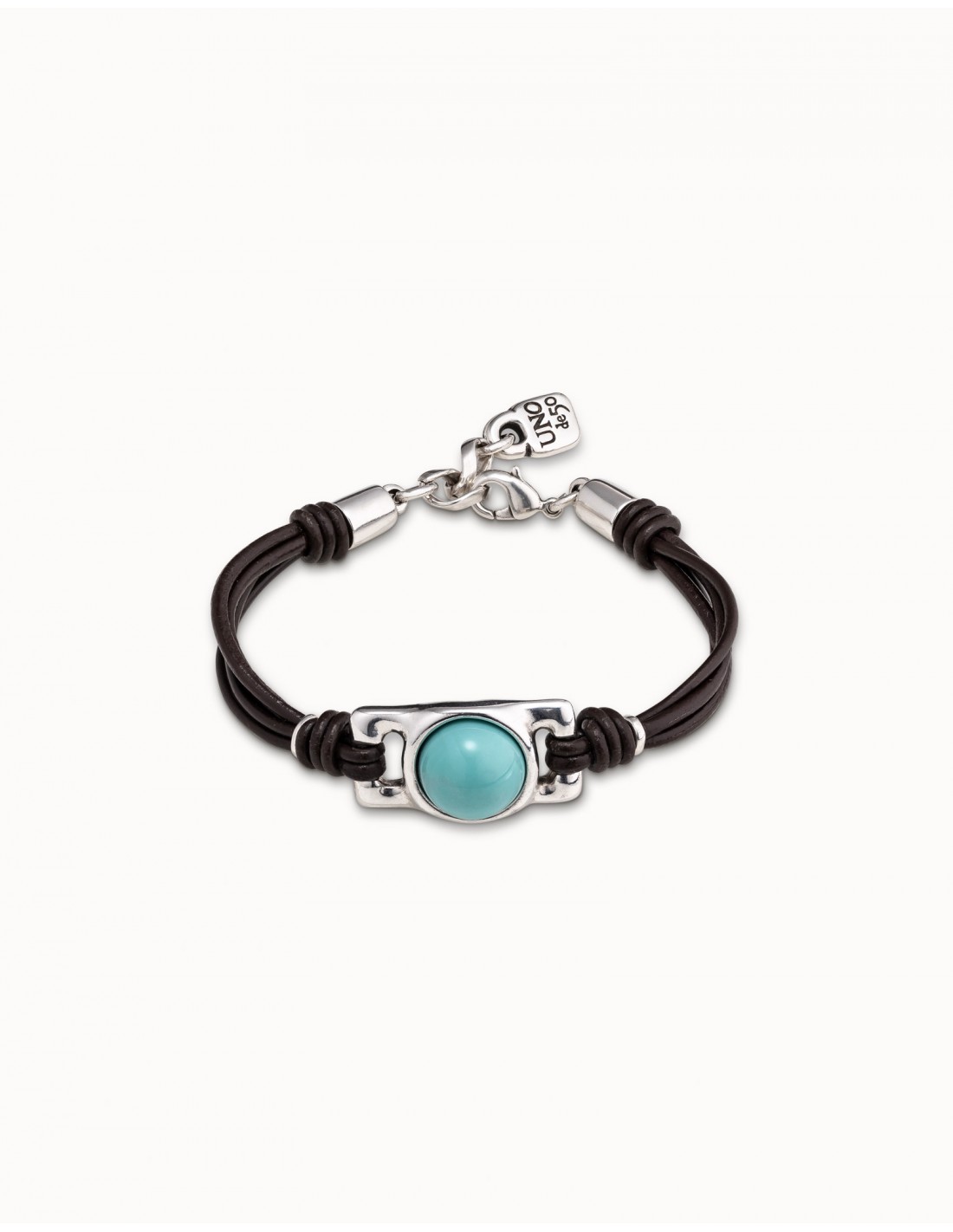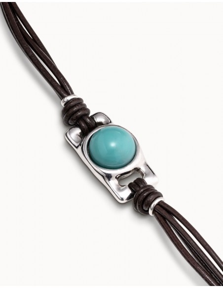 Pulsera de cuero marrón con un abalorio central rectangular y un cristal de Murano redondo de color verde agua. Dispone de cierre de mosquetón. Este collar ha sido confeccionado en España bajo un proceso artesanal, con una aleación de metales bañados en plata. Una joya ideal para el día a día, hazte con ella o regálasela a una persona especial.