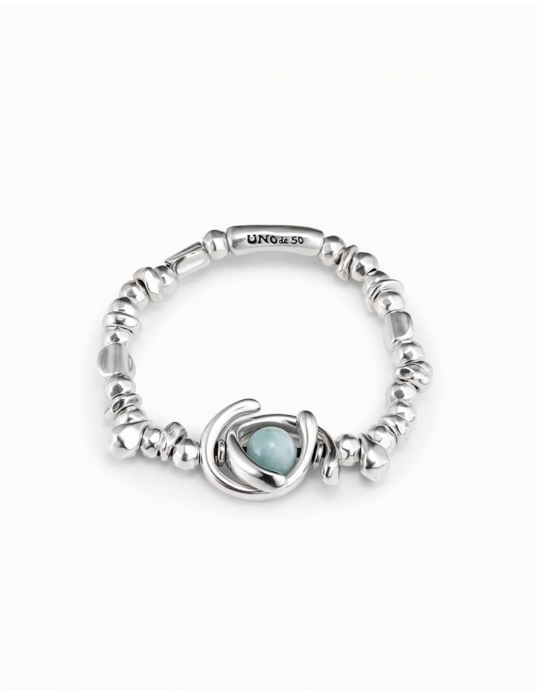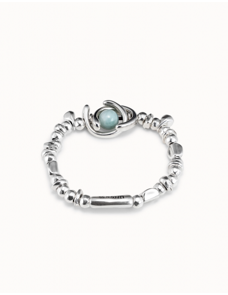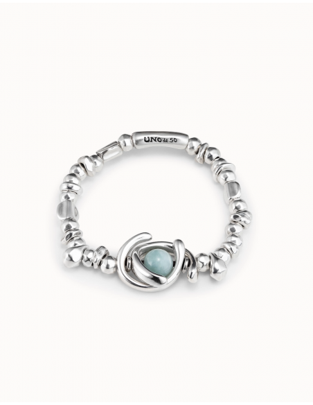 La pulsera Full Moon es una pieza elástica de una vuelta. Sostiene un abalorio de doble luna y una piedra amazonita. Su elaboración artesanal en España convierte esta joya en una pieza única, que ha sido elaborada con materiales de primera calidad, utilizando una aleación de metales que finalizan en un baño de plata. Consigue esta pulsera y conviertela en una pieza esencial de tu día a día.