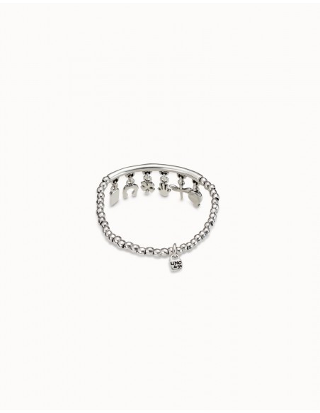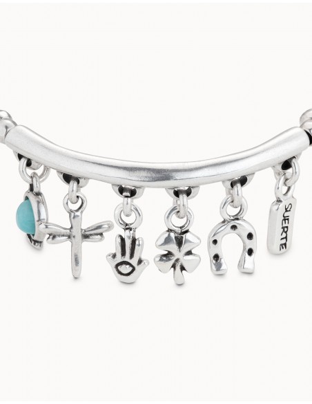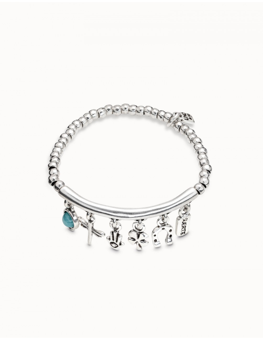 La pulsera Luckykeys es un diseño elástico protagonizado por seis simbólicos charms: amazonita, libélula, mano, trebol, herradura y mensaje. Está elaborada minuciosamente en España con una aleación de metales bañados en plata. Luce esta única pulsera y conviértete en el centro de todas las miradas.